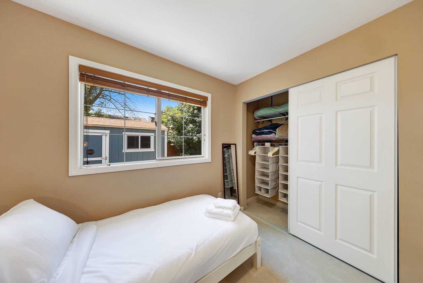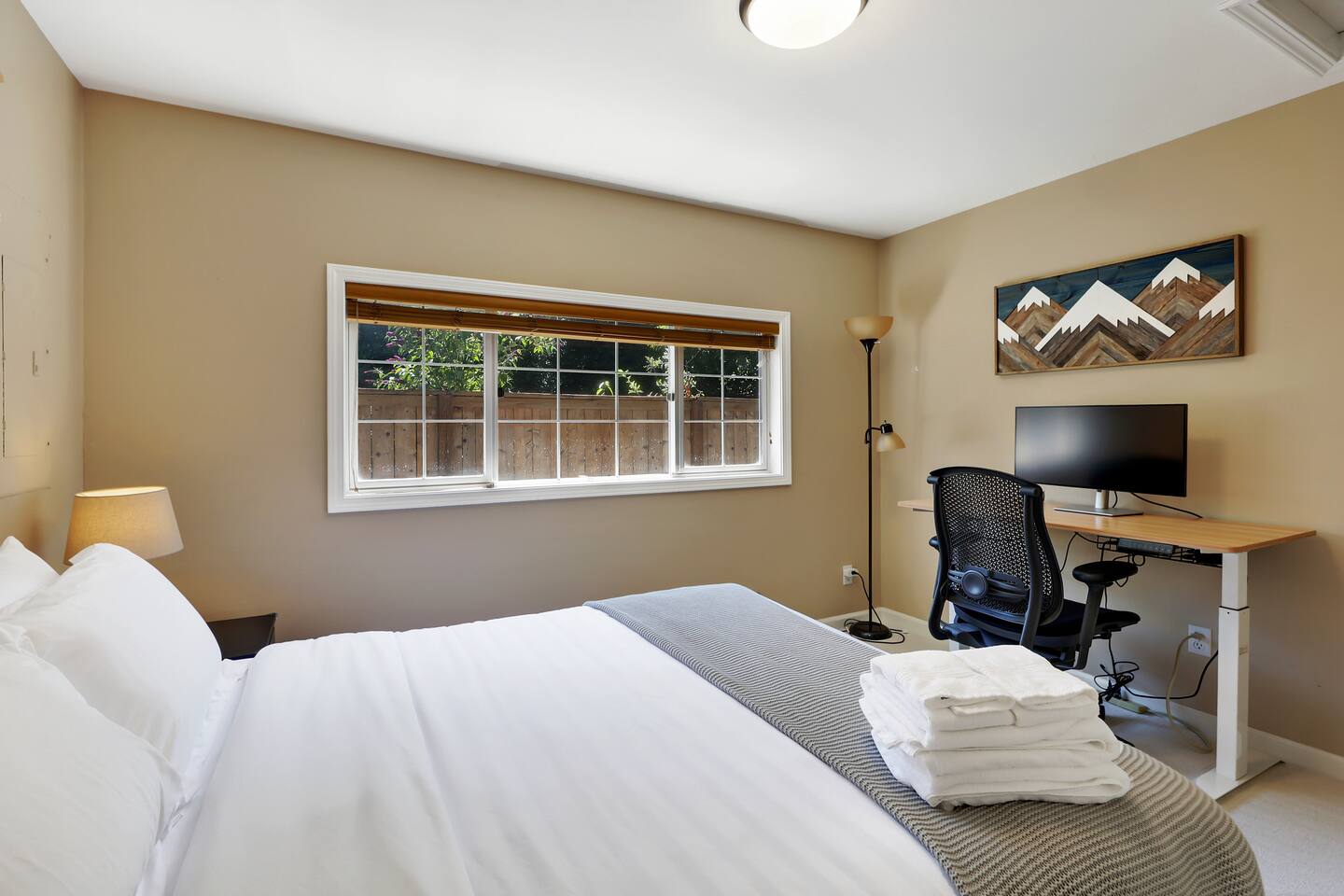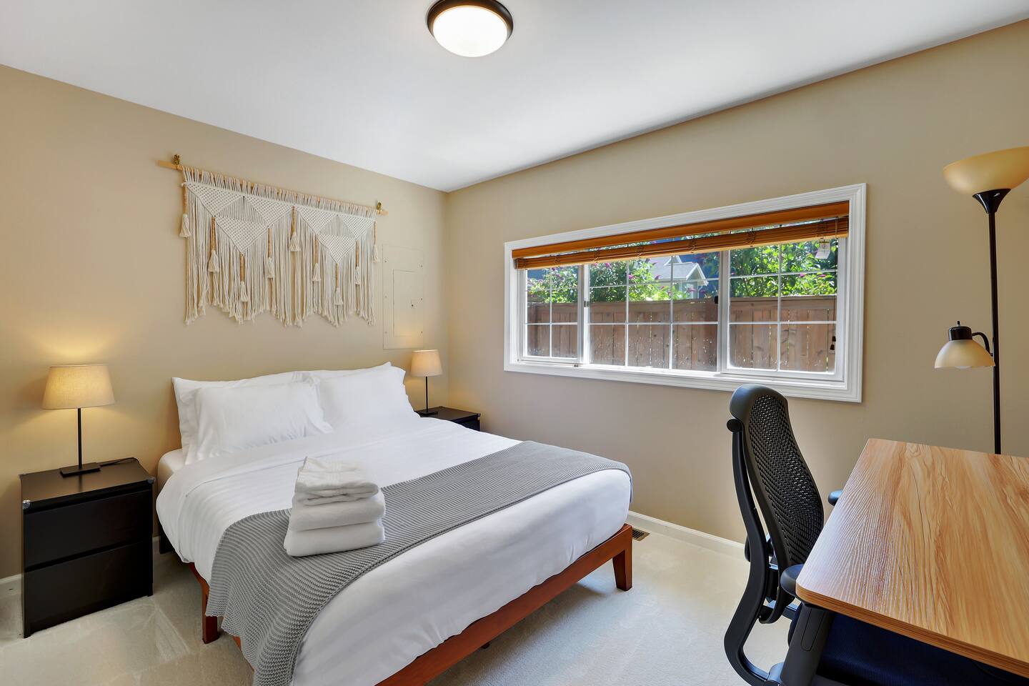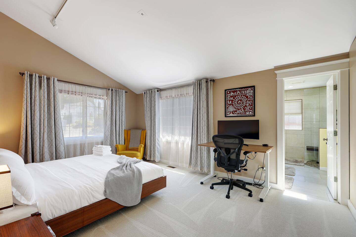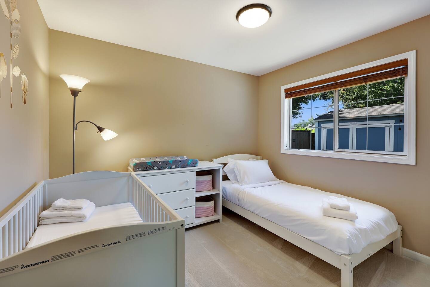 **Home Layout** Entry/Living Room - Smart TV, Peloton Bike and workout equipment, children books and toys. Kitchen - Fully stocked chef's kitchen with brand new stainless steel appliances. Dining Room - Dining table with seating for six. Primary Bedroom - Queen size bed, closet, dedicated workspace, ensuite bathroom with standing shower. Second Bedroom - Queen size bed, closet, and dedicated workspace. Third Bedroom - Twin size bed and crib. Exterior - Private backyard with table and seating for three - Front yard with lawn (unfenced).
