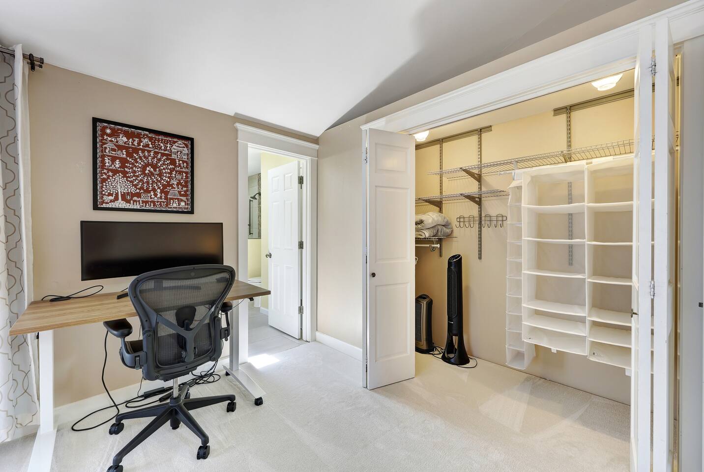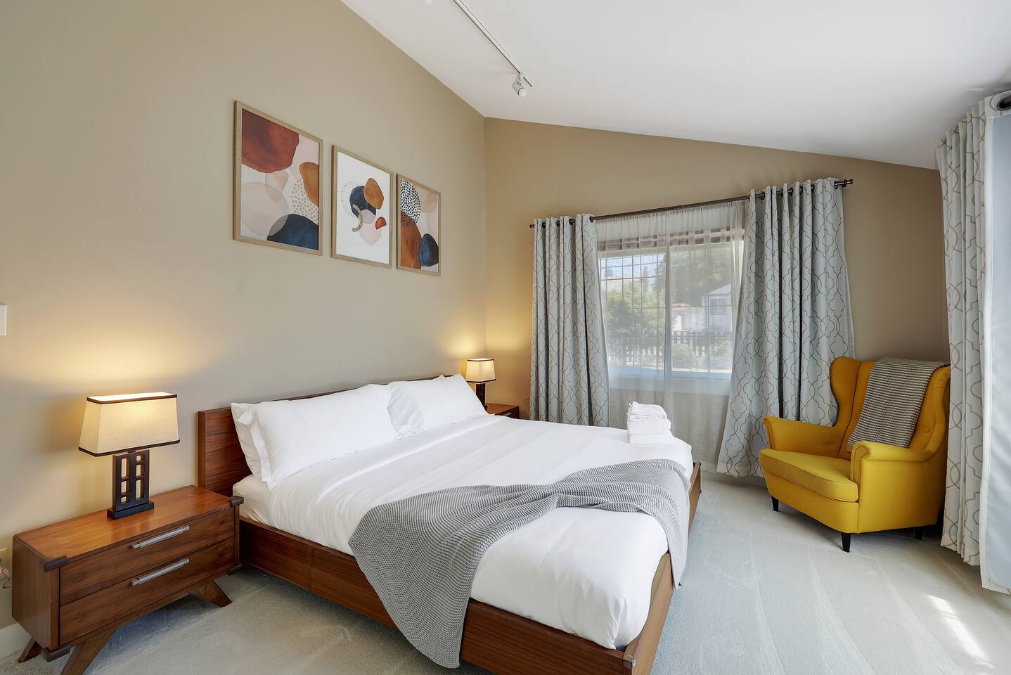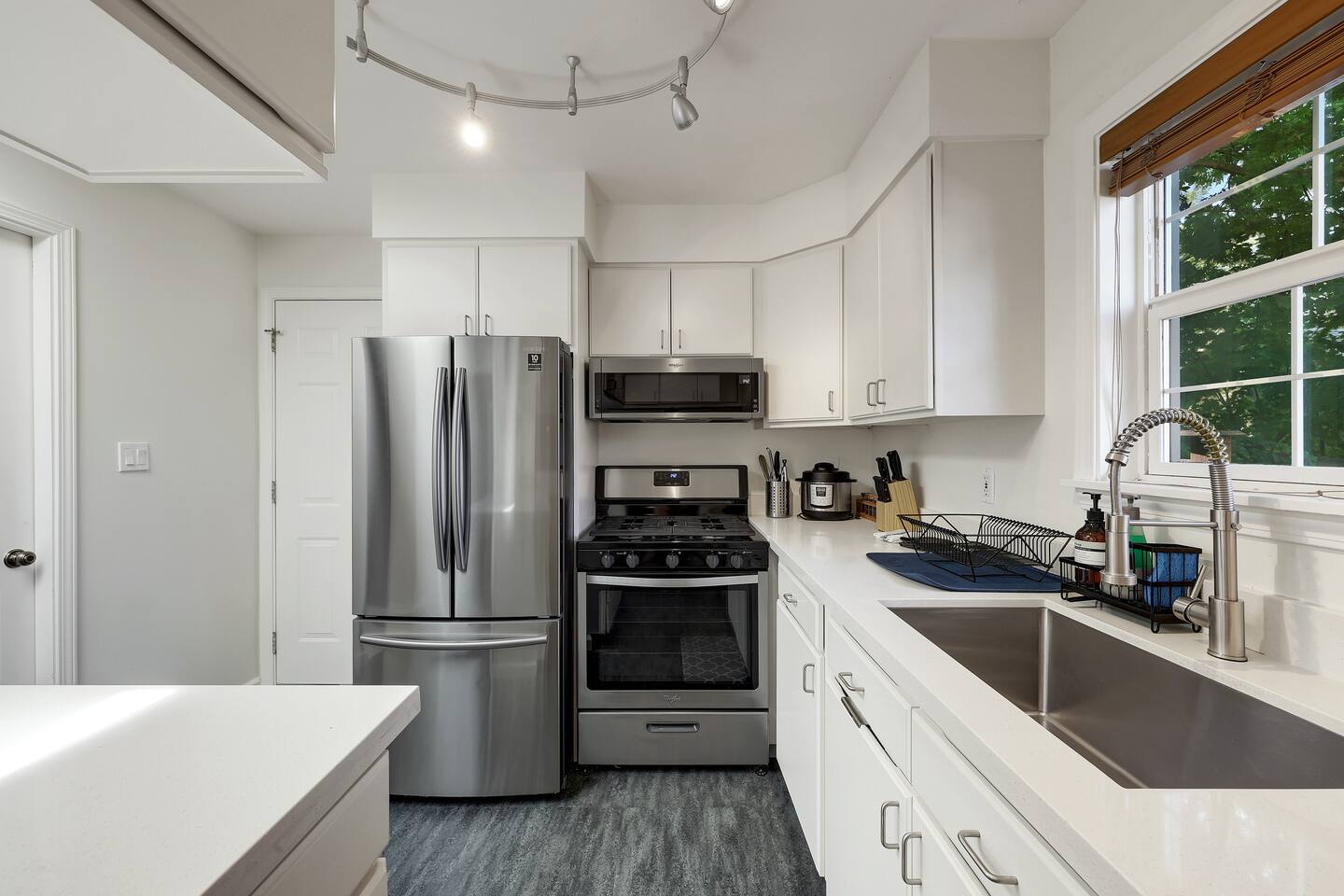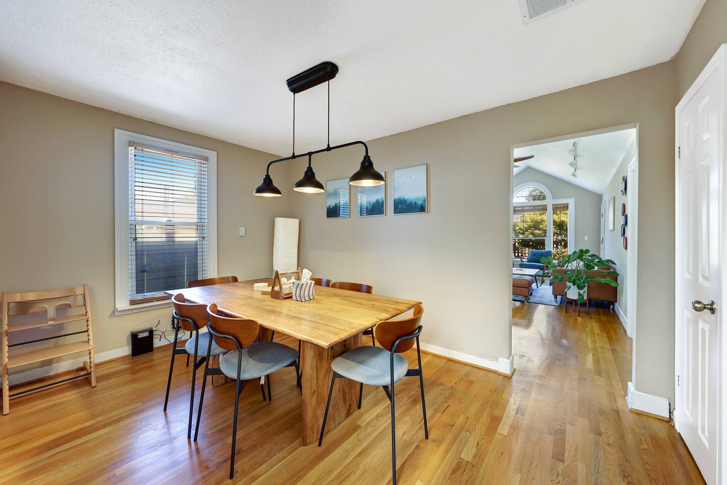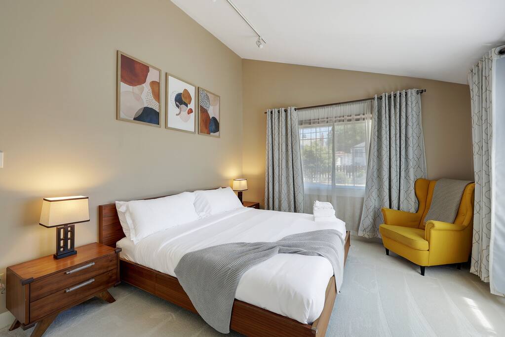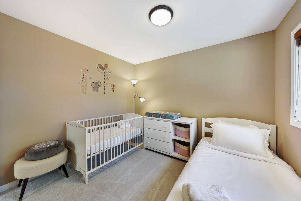 **Home Layout** Entry/Living Room - Smart TV, Peloton Bike and workout equipment, children books and toys. Kitchen - Fully stocked chef's kitchen with brand new stainless steel appliances. Dining Room - Dining table with seating for six. Primary Bedroom - Queen size bed, closet, dedicated workspace, ensuite bathroom with standing shower. Second Bedroom - Queen size bed, closet, and dedicated workspace. Third Bedroom - Twin size bed and crib. Exterior - Private backyard with table and seating for three - Front yard with lawn (unfenced).