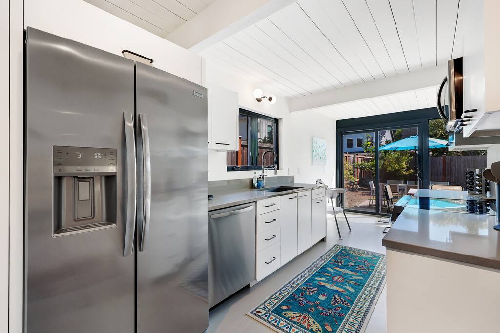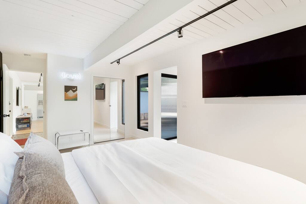 **Home Layout** - Fenced backyard area with dining and lounge furniture. - Gorgeously landscaped front yard and driveway for off street parking for three vehicles. - Garage/game room with ping pong table and Pacman arcade game. Parking for one vehicle on the right side. - Fully equipped kitchen with stainless steel appliances, perfect for entertaining. - Dining with plenty of light and seating to enjoy group meals for 6. The table can be extended to seat 8 with extra chairs in the garage. - Living room with designer furniture, fireplace, Smart TV preinstalled with streaming apps, board games, and reading nook. - Primary bedroom with King size bed, large walk-in closet, private access to back patio, and en suite bathroom. - Guest bedroom with Queen size bed. - Guest bedroom with Queen size bed. - Guest bedroom with twin size bunkbed.