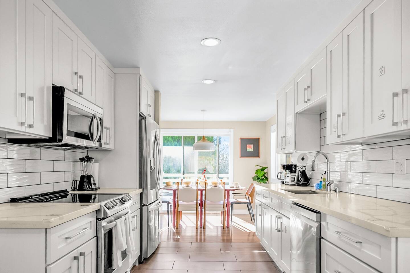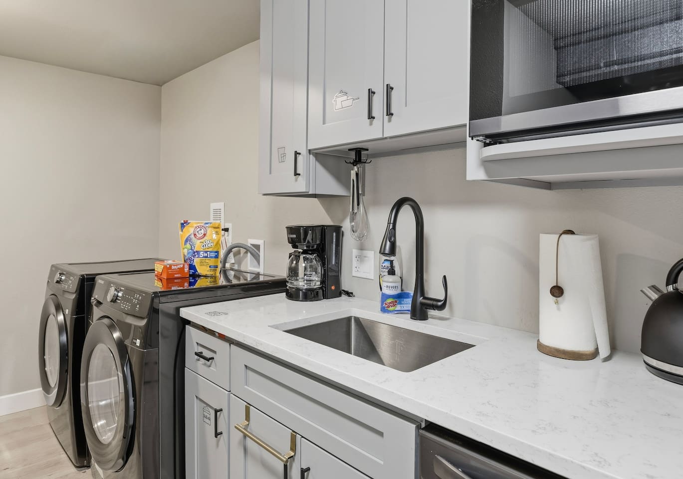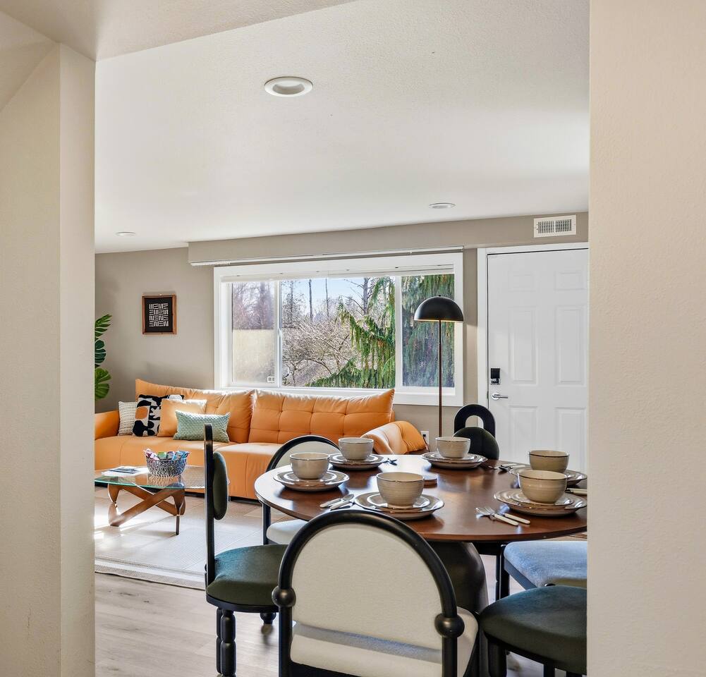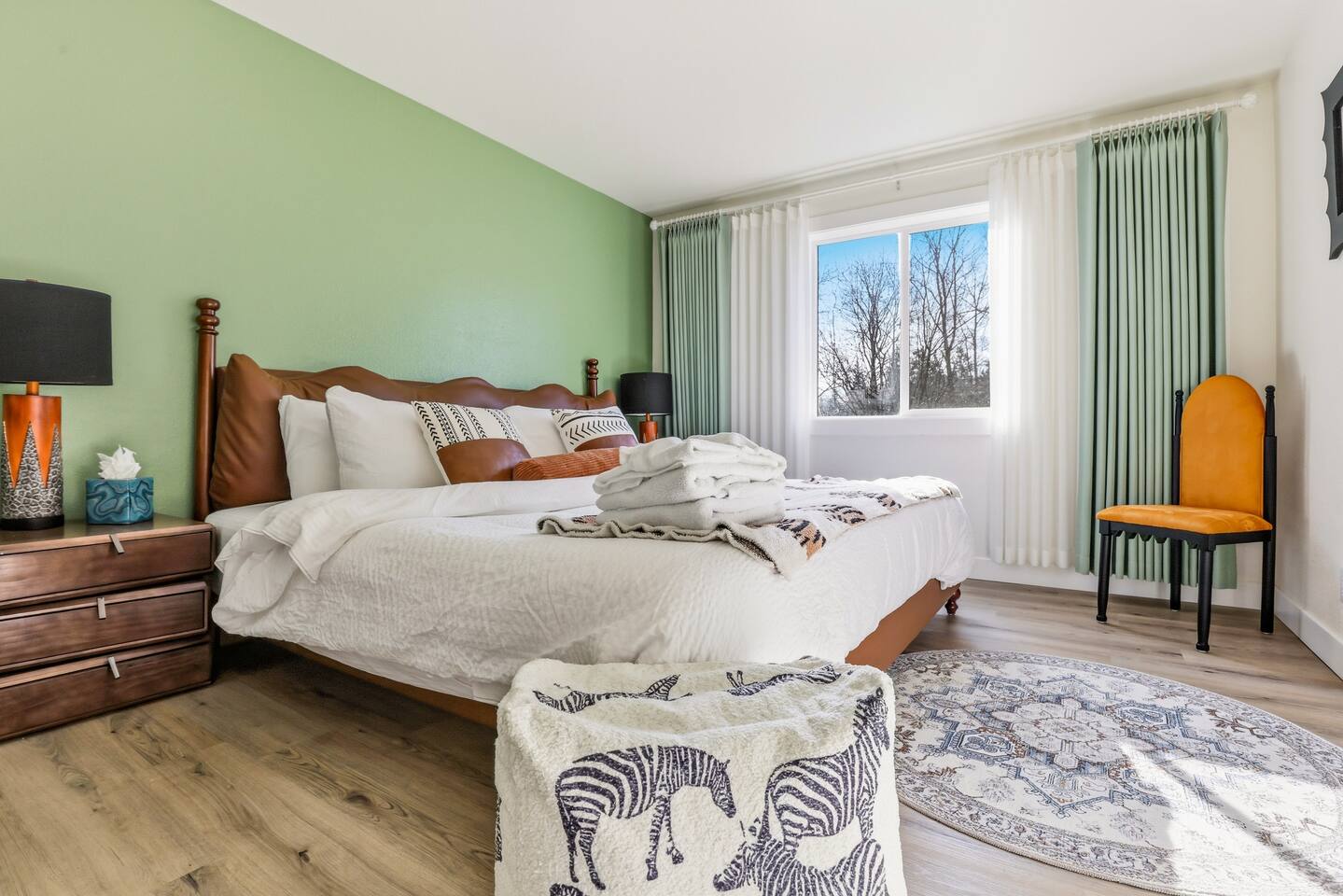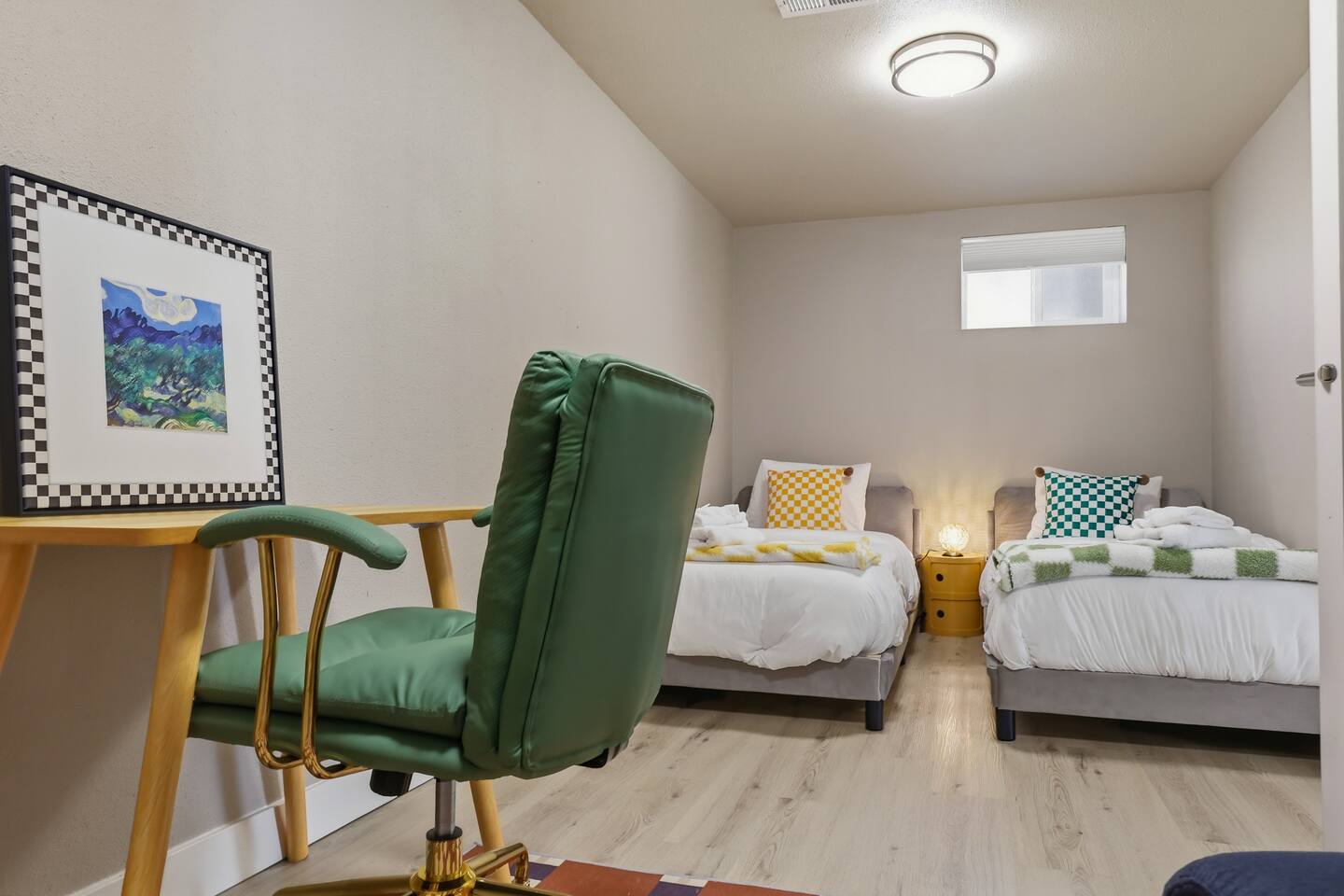 Home Layout: *Main Floor* - Living room with Smart TV - Dining room - Wrap around balcony with patio furniture - Kitchen with stainless steel appliances - Office nook - Garage with washer and dryer (no parking) - Primary bedroom with king bed - Two bedrooms with queen beds - Two full bathrooms *Lower Floor* - Chef's kitchen with stainless steel appliances - Dining table with seating for 6 - Living room with Smart TV - One bedroom with king bed - One bedroom with queen bed - One bedroom with two twin beds and a desk *Home Features* - Modern and chic design with comfortable furniture and high-end finishes. - Central AC and central heating. - Fresh linens and bedding for a comfortable sleep. - Driveway parking for four vehicles. - Fully-stocked kitchens with coffee maker, coffee, tea, hot chocolate, pots, pans, bowls, plates, glasses and utensils. - Smart TV with streaming apps pre-installed - just login! - High-speed WiFi (up to 1 Gbps) for all your working from home needs! - Two sets of washer and dryers, and laundry soap.