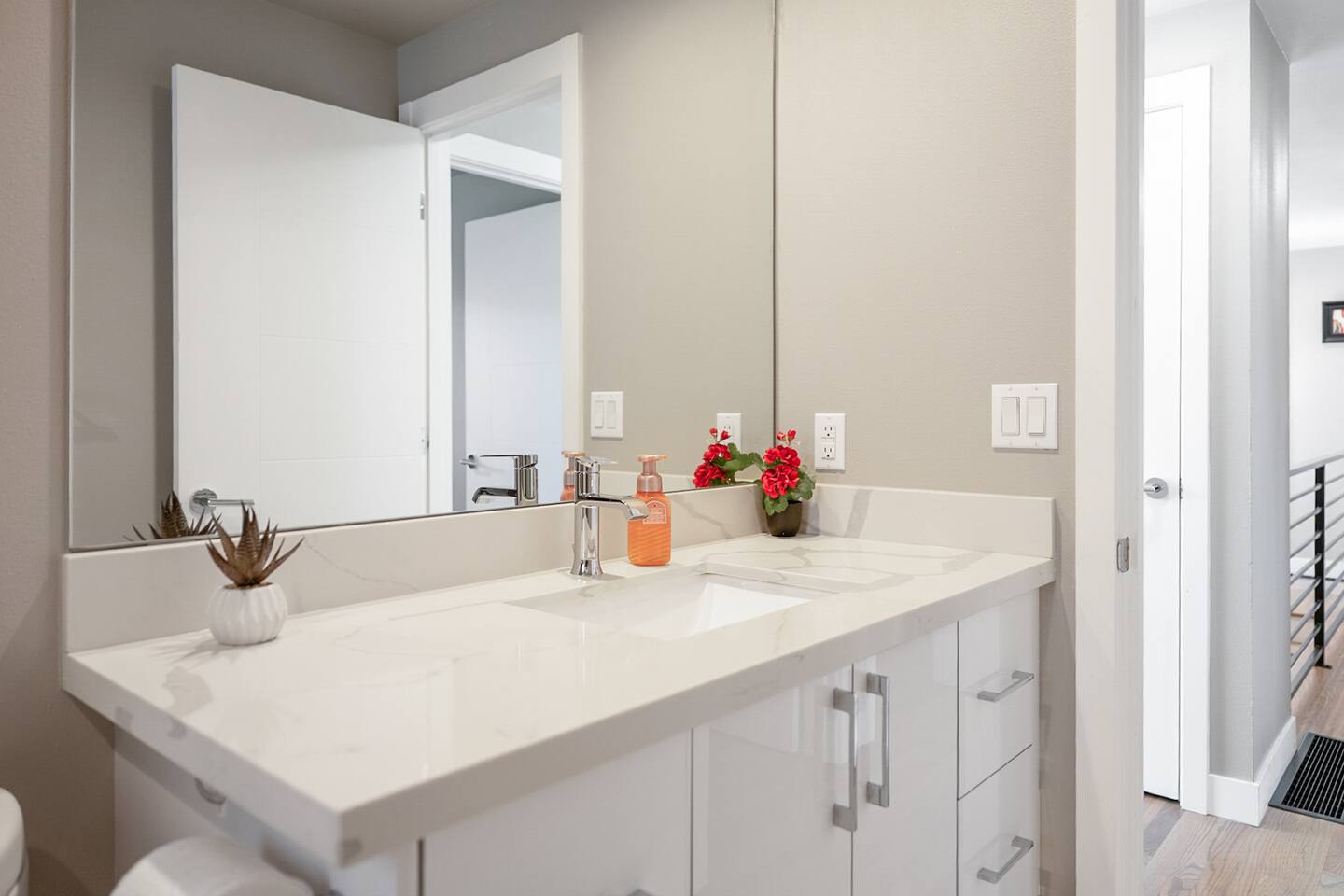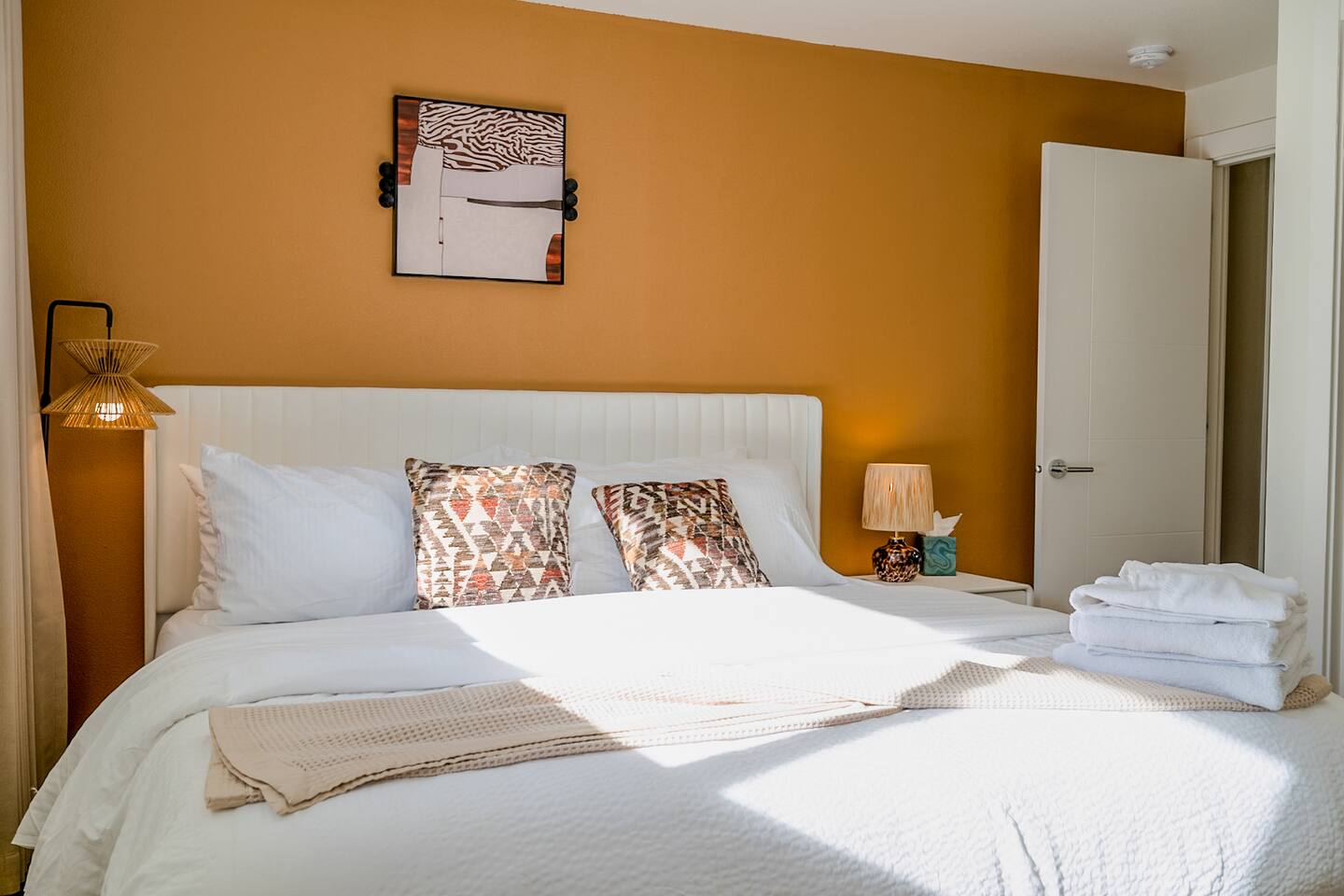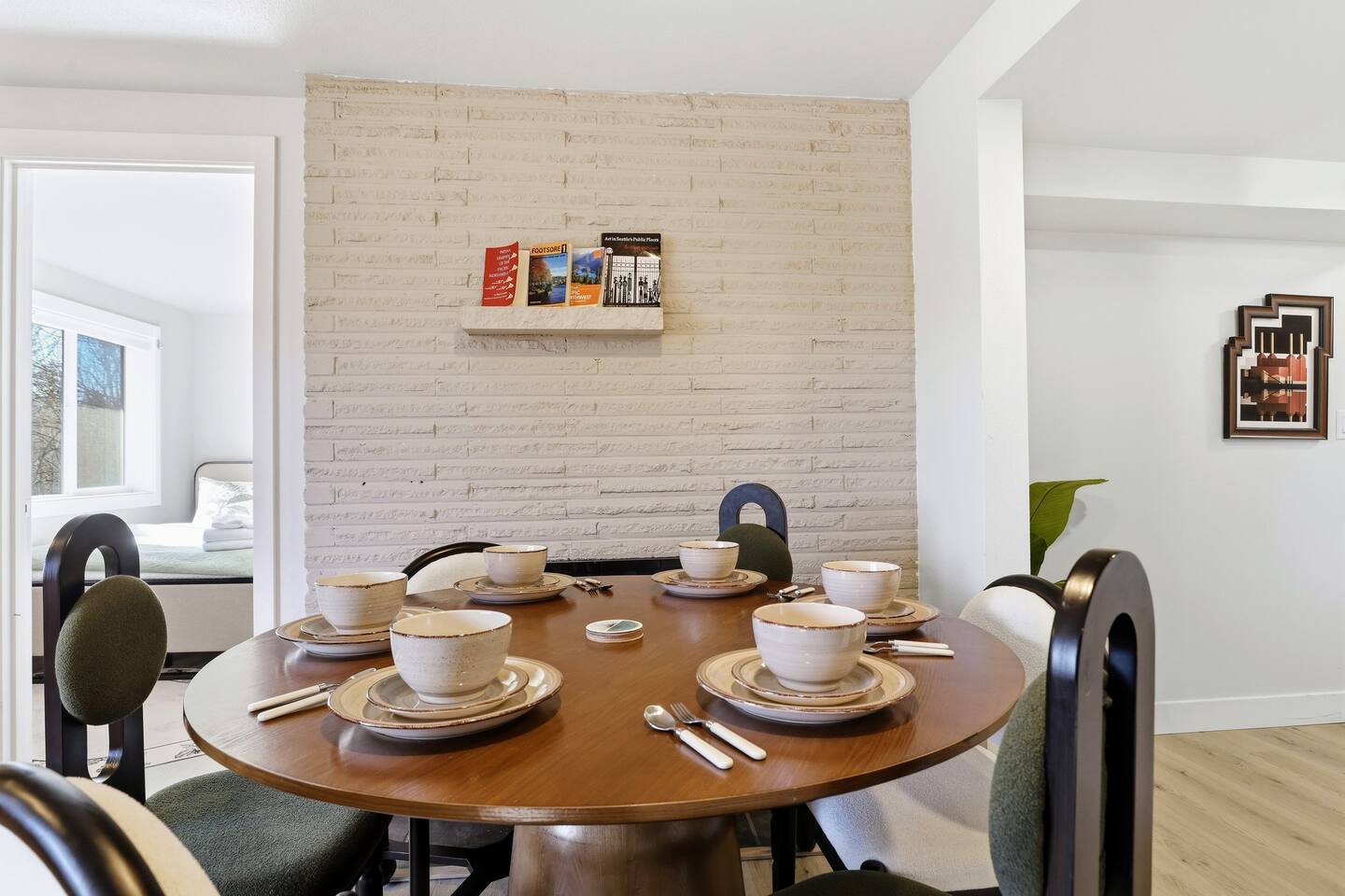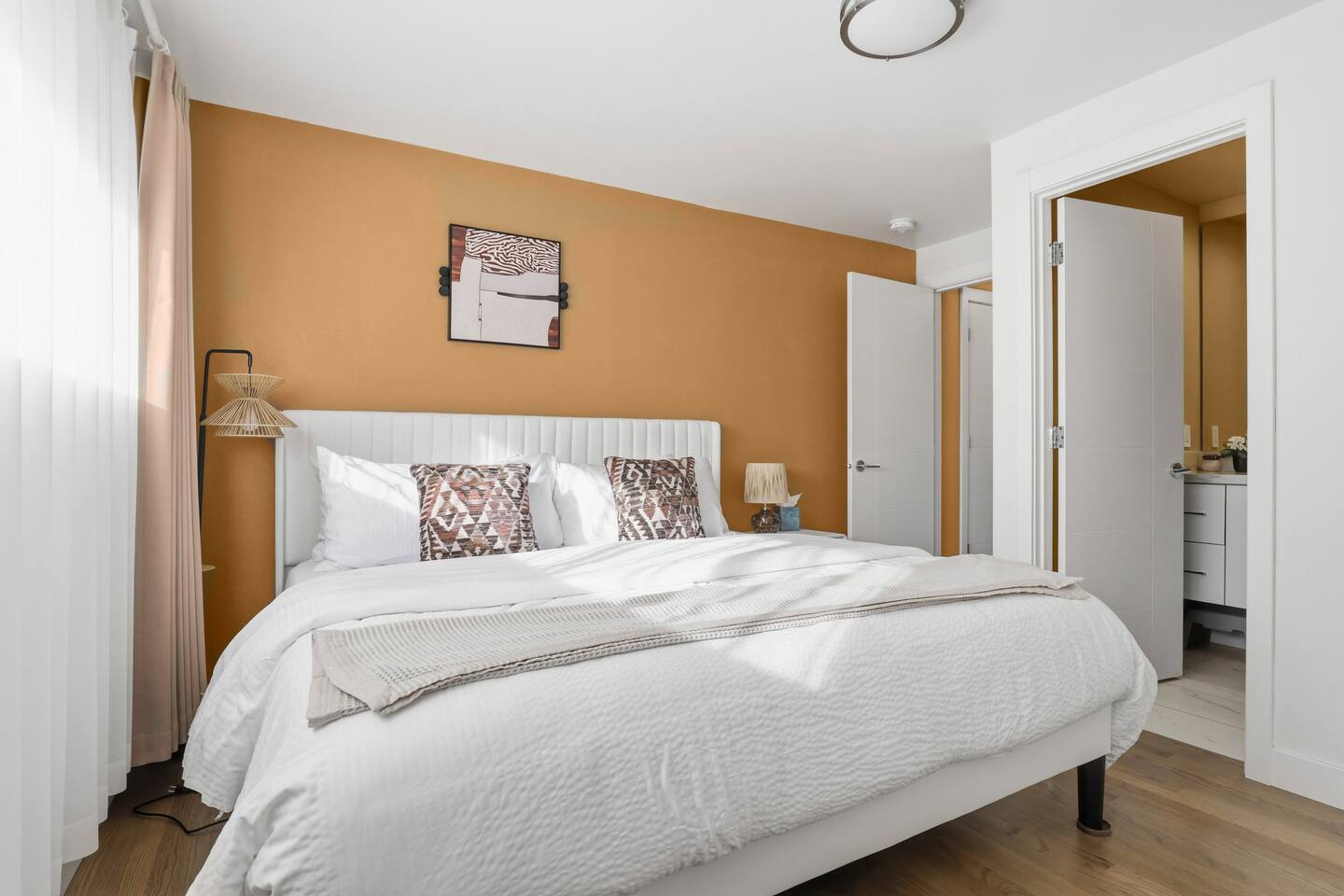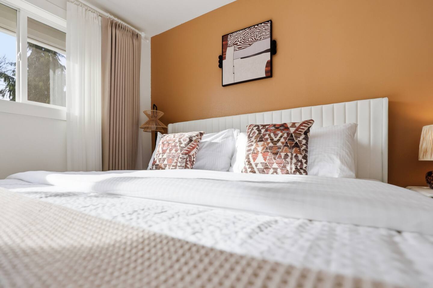 Home Layout: *Main Floor* - Living room with Smart TV - Dining room - Wrap around balcony with patio furniture - Kitchen with stainless steel appliances - Office nook - Garage with washer and dryer (no parking) - Primary bedroom with king bed - Two bedrooms with queen beds - Two full bathrooms *Lower Floor* - Chef's kitchen with stainless steel appliances - Dining table with seating for 6 - Living room with Smart TV - One bedroom with king bed - One bedroom with queen bed - One bedroom with two twin beds and a desk *Home Features* - Modern and chic design with comfortable furniture and high-end finishes. - Central AC and central heating. - Fresh linens and bedding for a comfortable sleep. - Driveway parking for four vehicles. - Fully-stocked kitchens with coffee maker, coffee, tea, hot chocolate, pots, pans, bowls, plates, glasses and utensils. - Smart TV with streaming apps pre-installed - just login! - High-speed WiFi (up to 1 Gbps) for all your working from home needs! - Two sets of washer and dryers, and laundry soap.