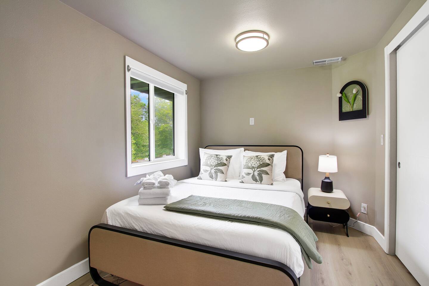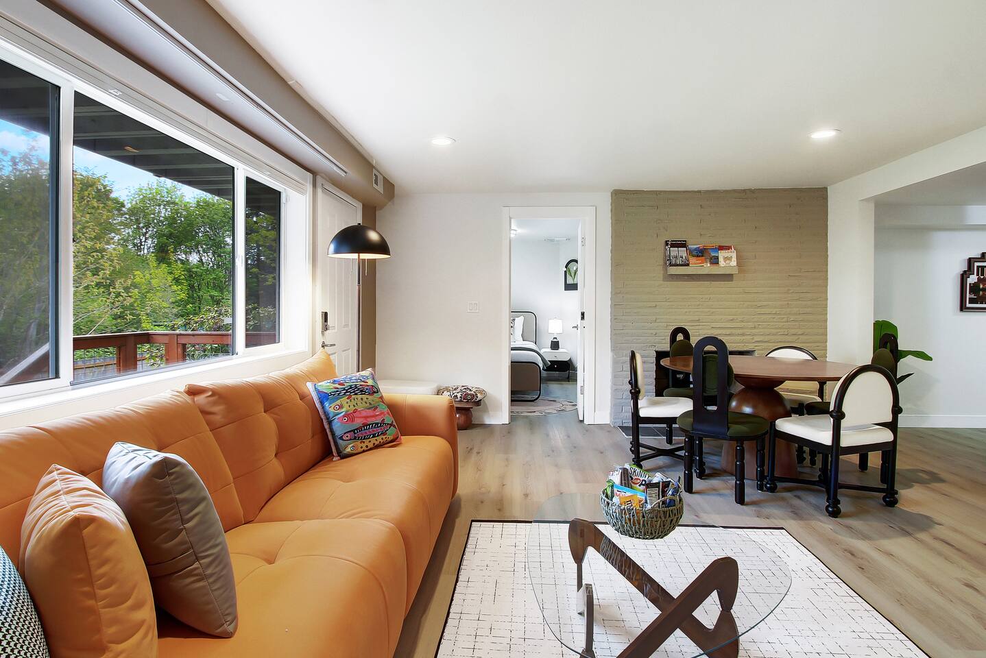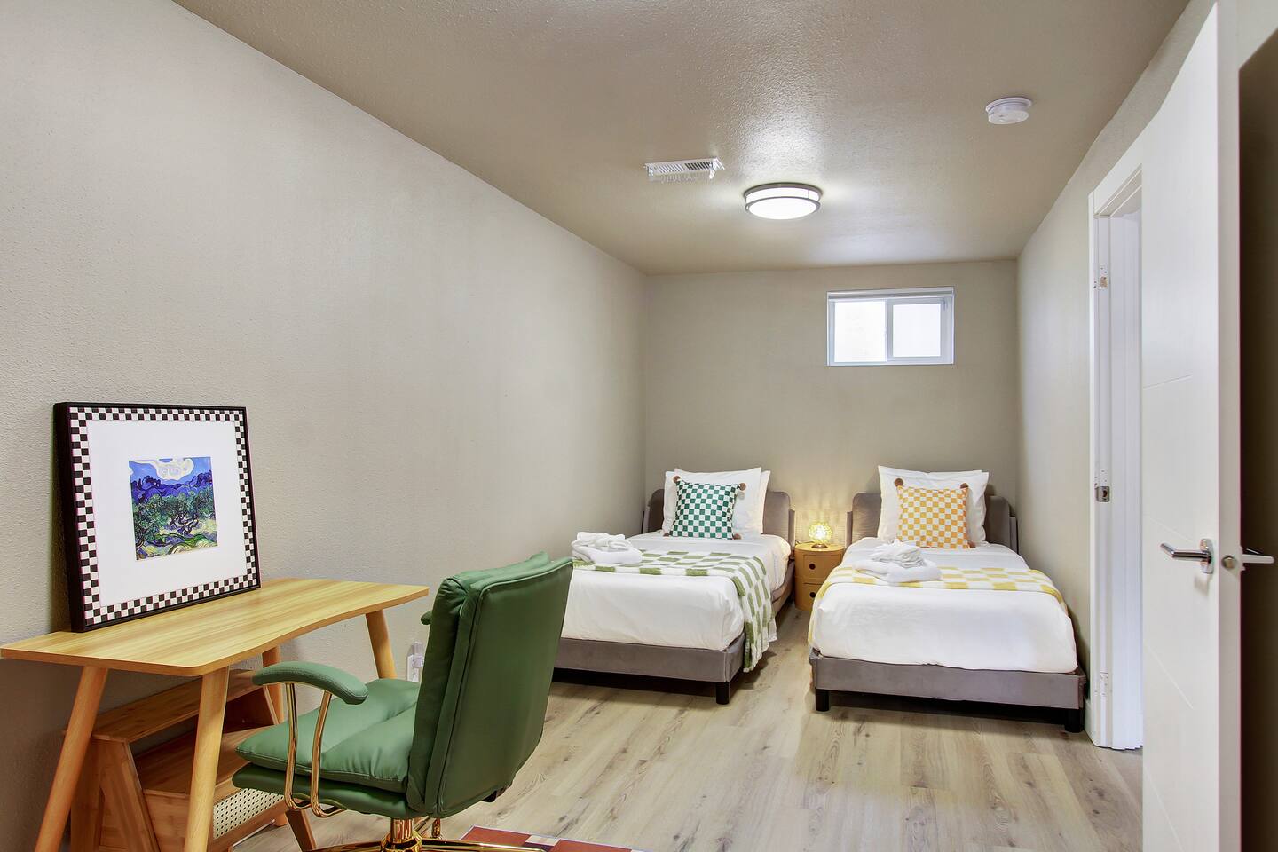 *Lower Unit of Duplex Layout* - Chef's kitchen with stainless steel appliances - Dining table with seating for 6 - Living room with Smart TV - One bedroom with queen bed - One bedroom with queen bed - One bedroom with two twin beds and a desk *Unit Features* - Modern and chic design with comfortable furniture and high-end finishes. - Central AC and central heating. - Fresh linens and bedding for a comfortable sleep. - Driveway parking for two vehicles (stick to right side for lower unit, upper unit will have two spots on the left side of the driveway). - Fully-stocked kitchen with coffee maker, coffee, tea, hot chocolate, pots, pans, bowls, plates, glasses and utensils. - Smart TV with streaming apps pre-installed - just login! - High-speed WiFi (up to 1 Gbps) for all your working from home needs! - Washer and dryer, and laundry soap.