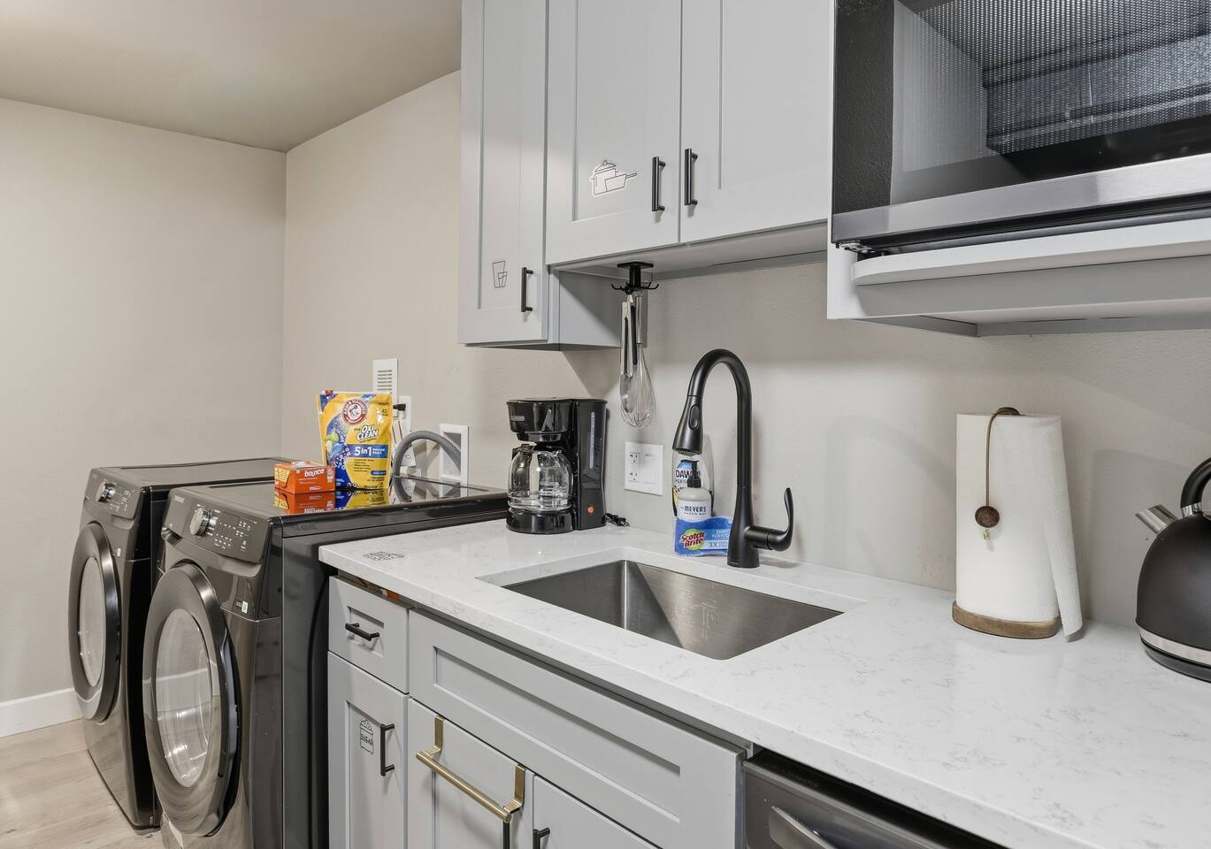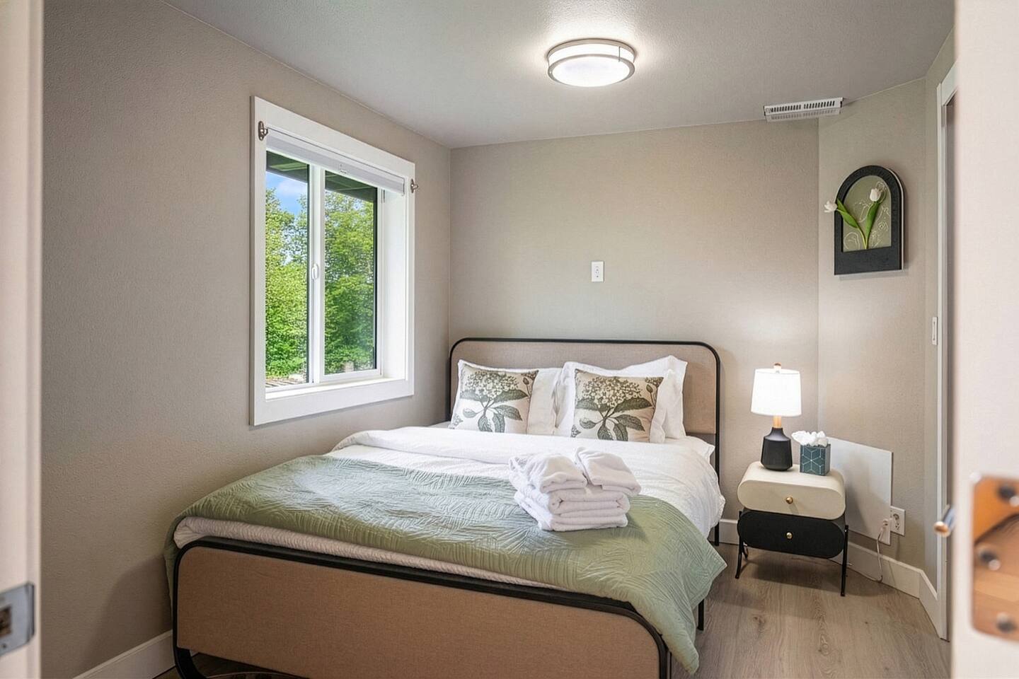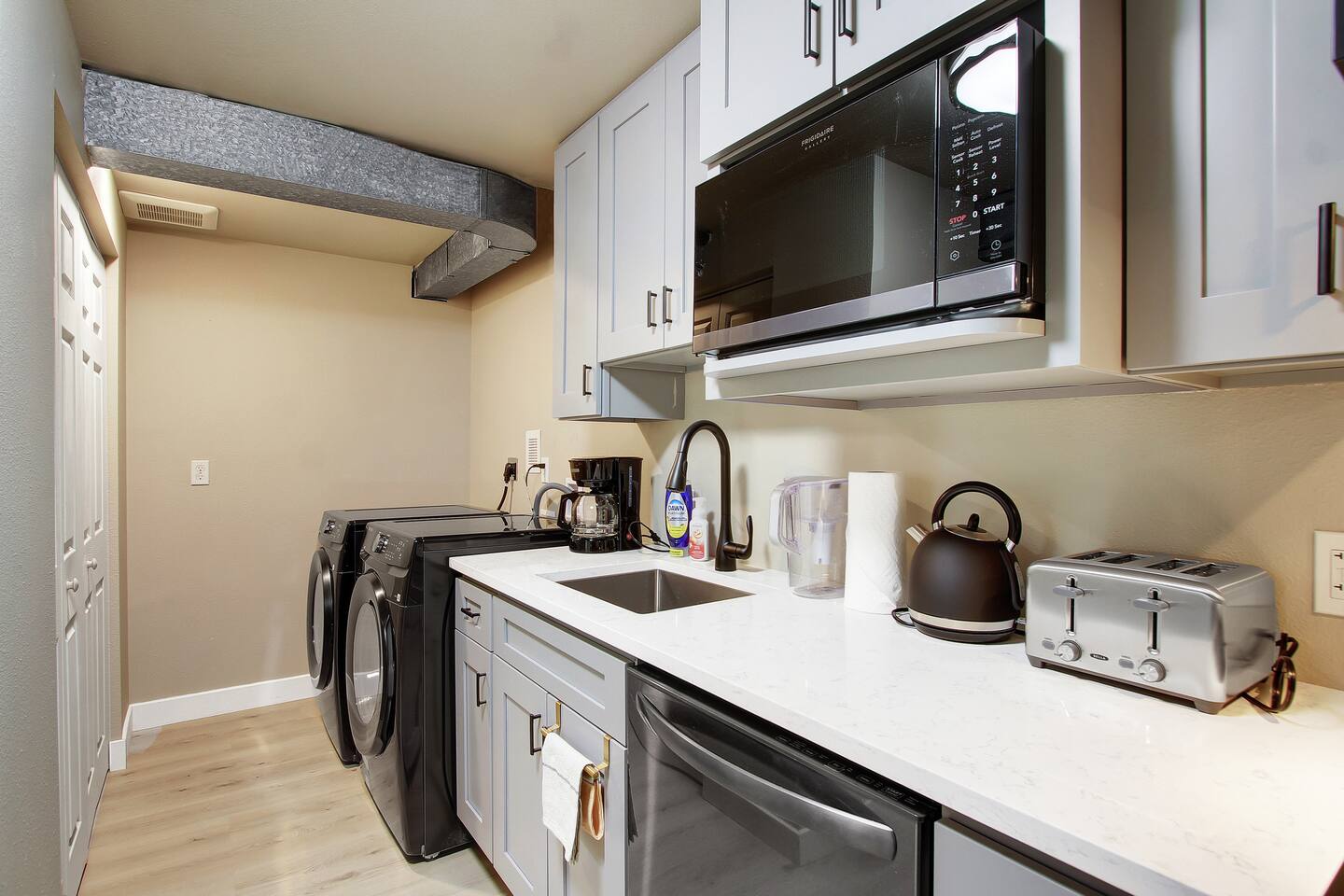 *Lower Unit of Duplex Layout* - Chef's kitchen with stainless steel appliances - Dining table with seating for 6 - Living room with Smart TV - One bedroom with queen bed - One bedroom with queen bed - One bedroom with two twin beds and a desk *Unit Features* - Modern and chic design with comfortable furniture and high-end finishes. - Central AC and central heating. - Fresh linens and bedding for a comfortable sleep. - Driveway parking for two vehicles (stick to right side for lower unit, upper unit will have two spots on the left side of the driveway). - Fully-stocked kitchen with coffee maker, coffee, tea, hot chocolate, pots, pans, bowls, plates, glasses and utensils. - Smart TV with streaming apps pre-installed - just login! - High-speed WiFi (up to 1 Gbps) for all your working from home needs! - Washer and dryer, and laundry soap.