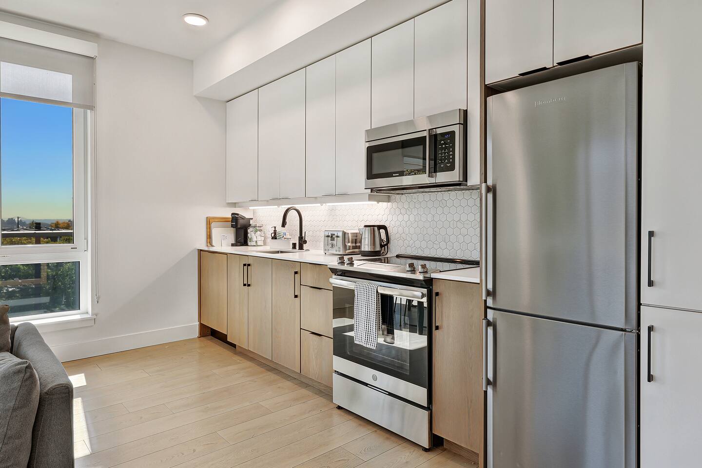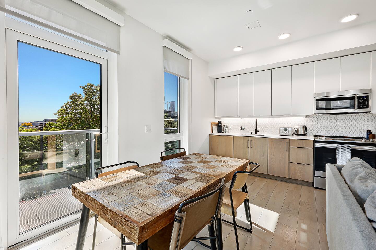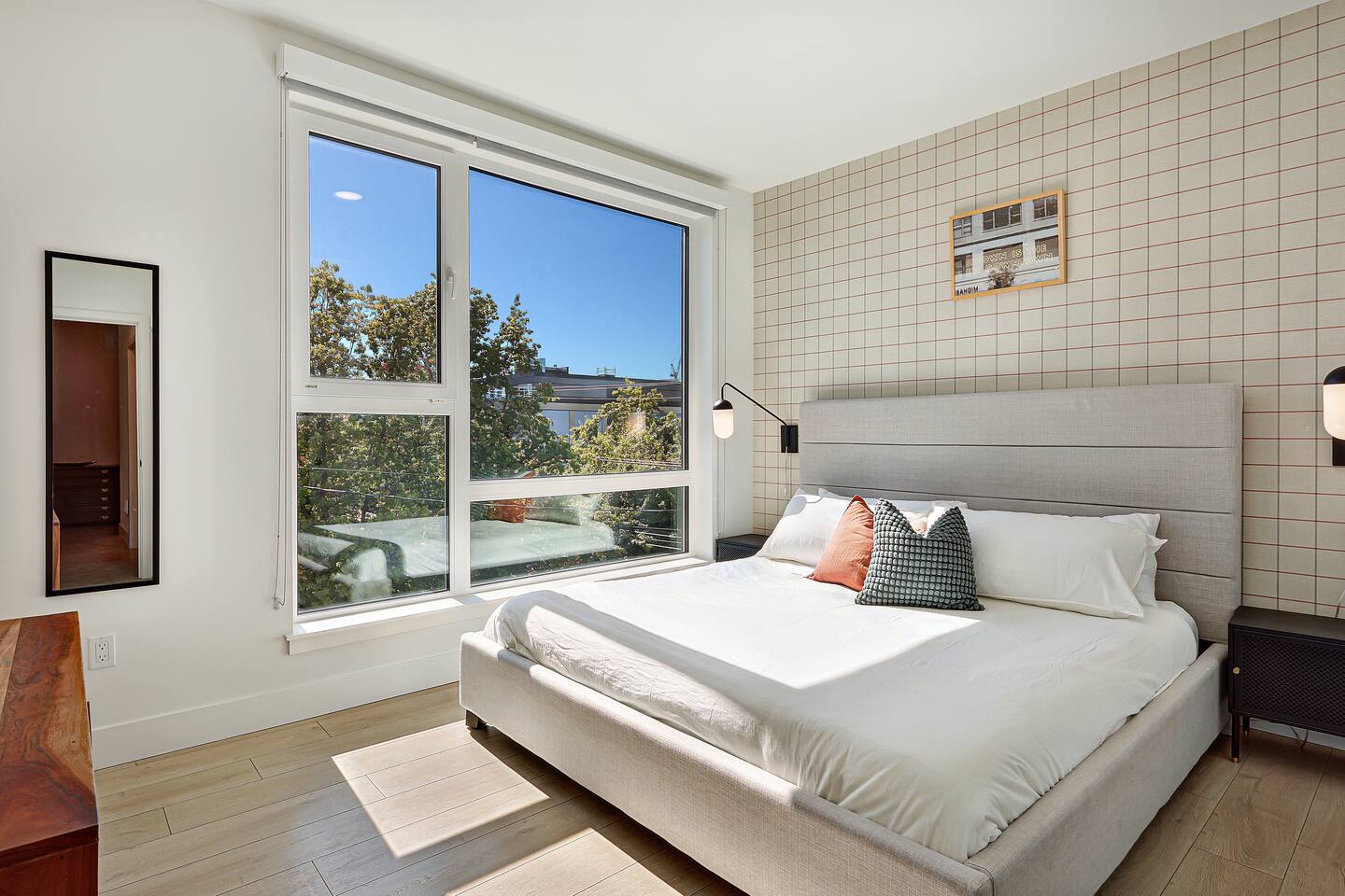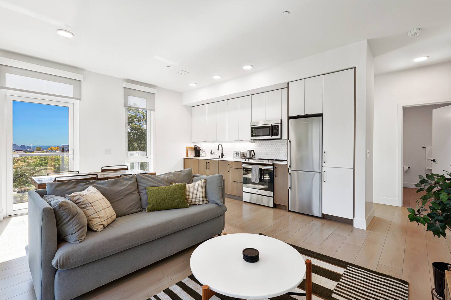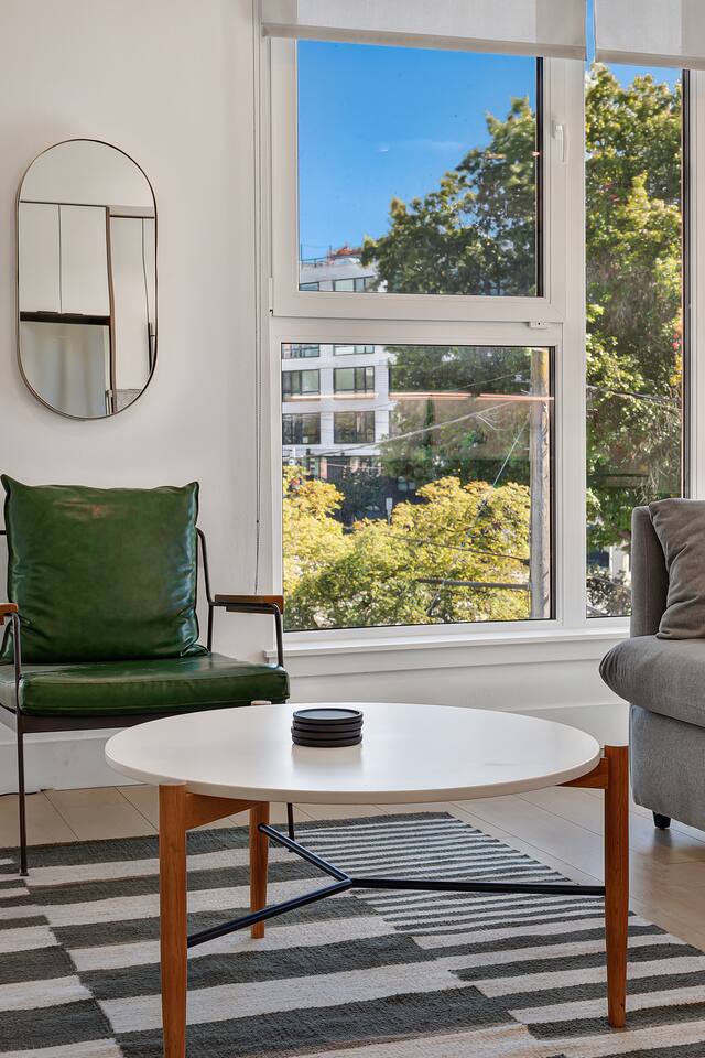 Welcome to your eco-luxury retreat in the heart of Capitol Hill! Our spacious 2 bedroom x 1 bathroom apartment at Solis blends modern design with comfort, featuring floor-to-ceiling windows, stylish furnishings, Smart TV, and air conditioning in the living room. The space includes: - Two bedrooms with plush king-size beds and premium mattresses - One full bathroom with modern fixtures and spa-like touches - Open-concept living room with Smart TV and comfortable seating - Fully equipped kitchen with modern appliances and essentials - Dining table with seating for four - High-speed WiFi throughout the apartment Building amenities: - Rooftop deck with BBQ grills, outdoor dining, lounge seating, pergola & stunning city views - Eco-friendly, sustainable building designed to Passive House standards Location highlights: Located in the lively Pike/Pine corridor of Capitol Hill, you’ll be just steps away from: - Trendy cafés, bars, and restaurants, same block as The Cuff Complex - Boutique shops and local markets - The Capitol Hill light rail station for easy access downtown & UW - Nearby parks and green spaces for a breath of fresh air Perfect for both work and play, this is your stylish home base to explore Seattle!