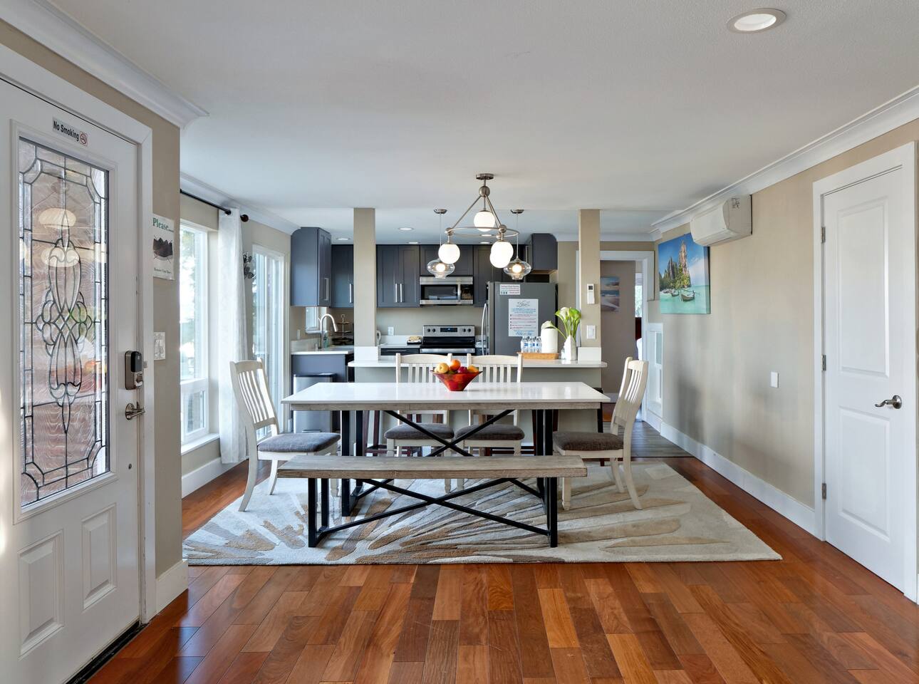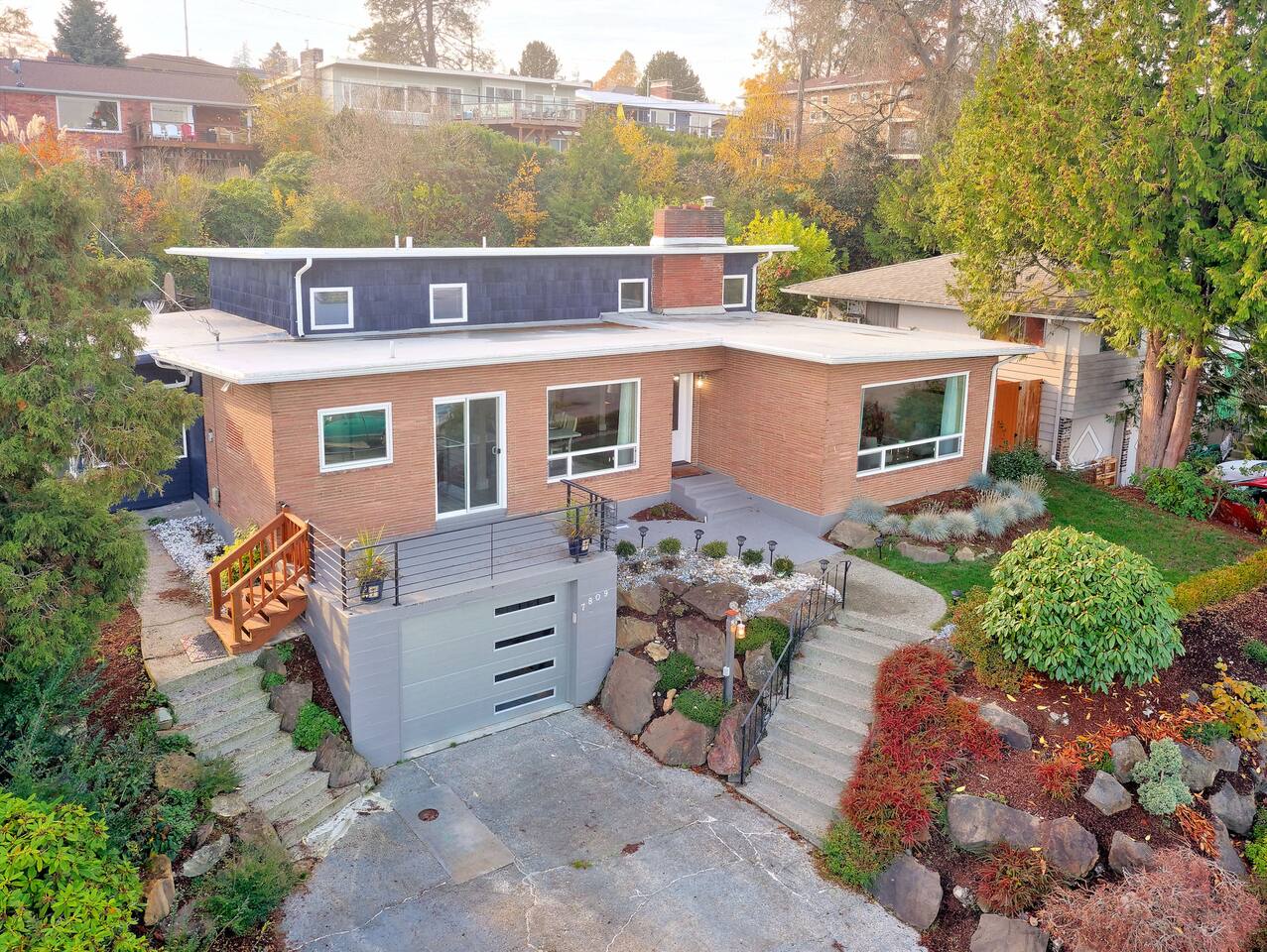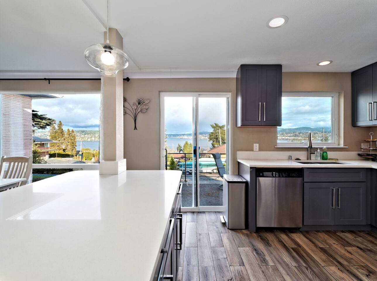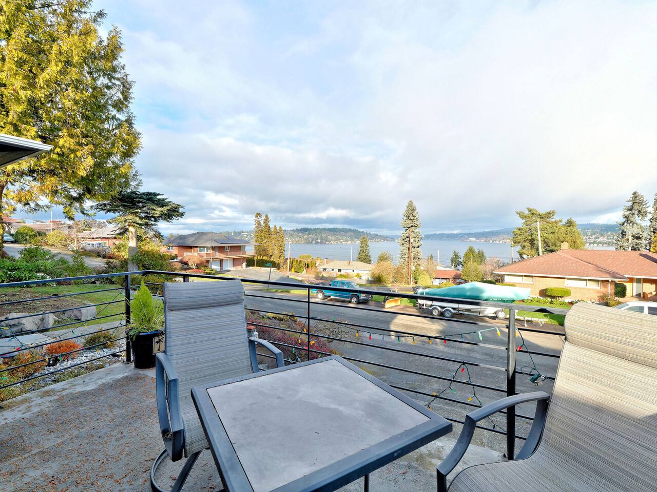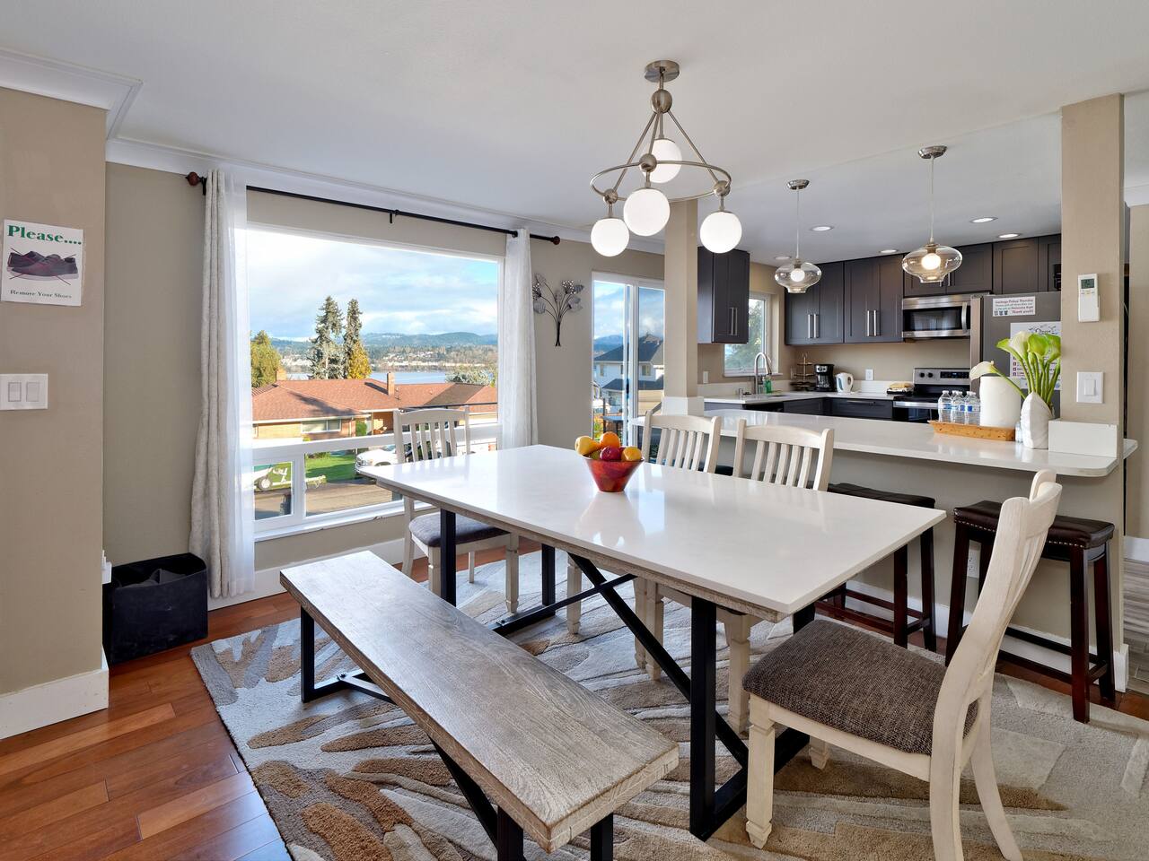 Escape to our mid-century modern retreat with stunning Lake Washington and mountain views, with room for groups up to 16. The living room's expansive window frames the serene lake, and the open floor plan with kitchen and dining opens to a view deck. Five bedrooms offer varied bedding options, complemented by 2.5 baths. Includes parking for up to five cars including an attached one-car garage.