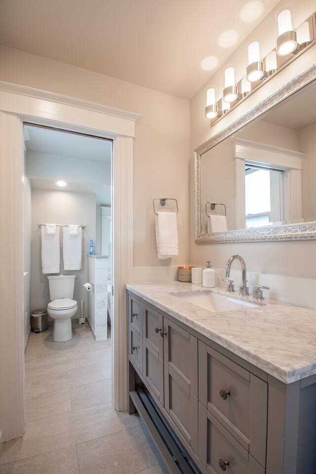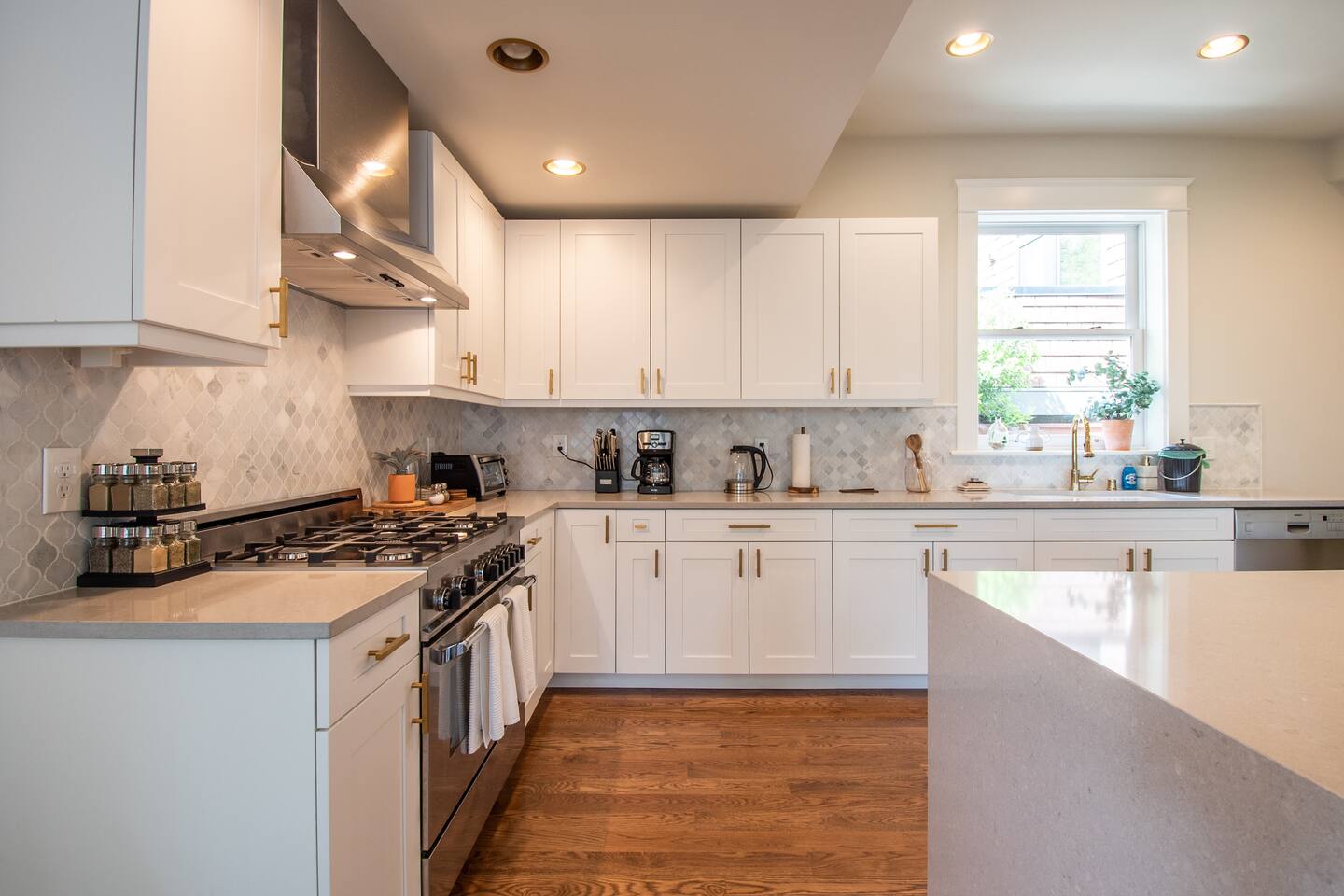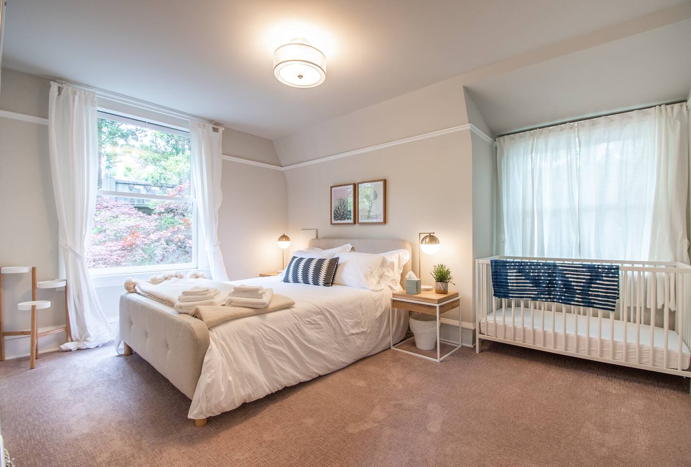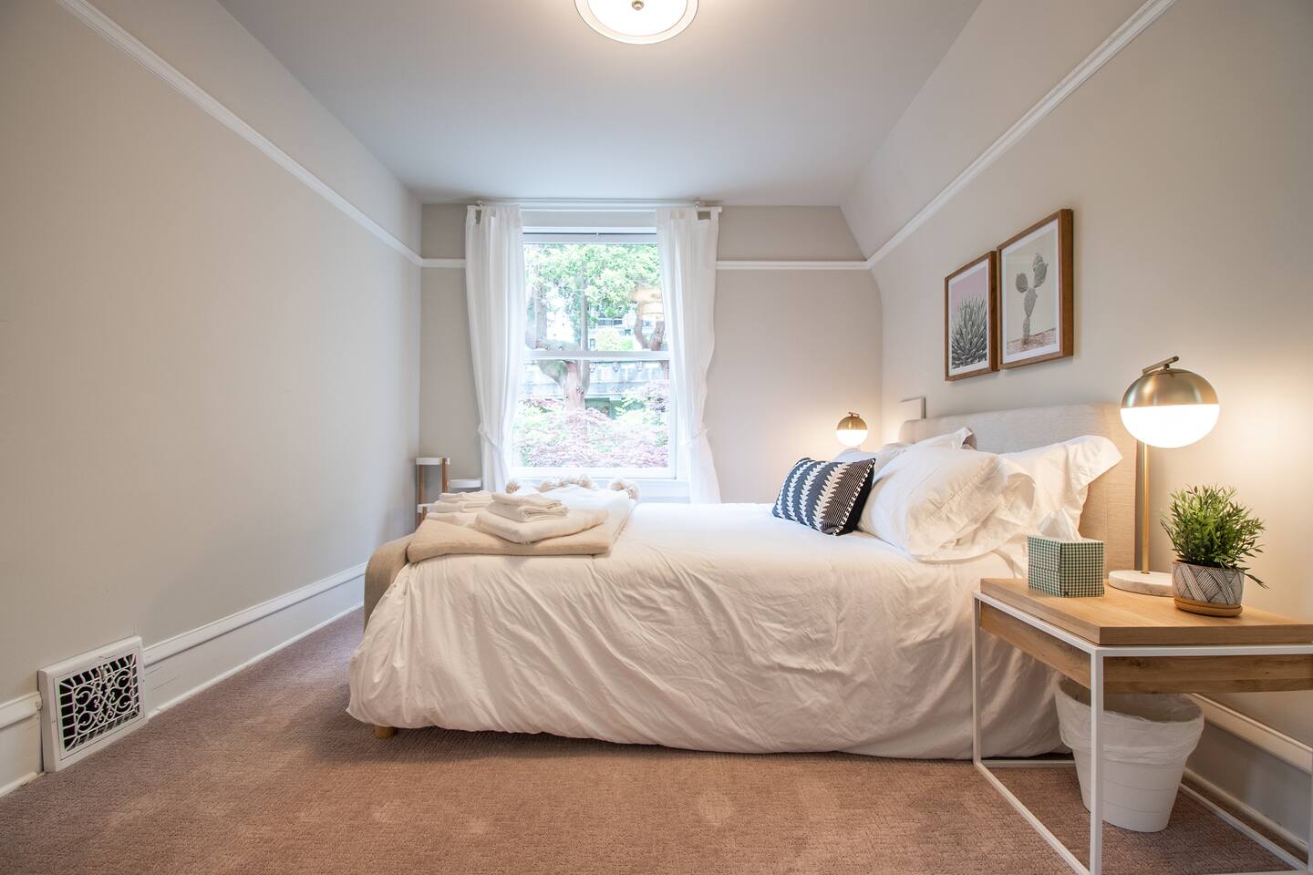 The main floor features a welcoming reception area, an open-concept living and dining room, a gourmet kitchen with a gas range, and a convenient powder room. The living room sofa doubles as a sofa bed, with linens provided. Upstairs, you’ll find three bedrooms and a full bath. The master bedroom includes a queen bed, a vanity sink separate from the bath, and a charming window seat with sound views. A second bedroom offers a queen bed and crib, while the third has a twin bed. The lower level of the home includes a full-size washer and dryer for guest use (detergent provided) and a private guest suite. The suite features a full kitchen, bathroom, living room with a sofa bed, and a bedroom with a queen bed. Outside, enjoy a stone patio shaded by evergreens and a covered front porch. Off-street parking is available in the alley behind the home, with additional free street parking nearby, as allowed by signage.