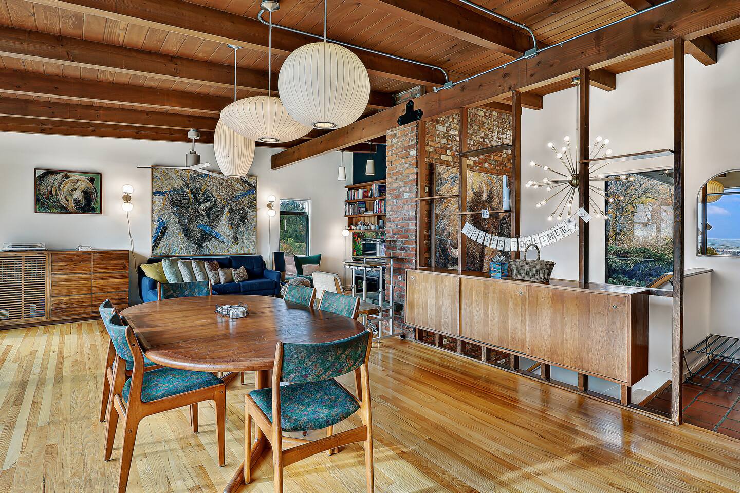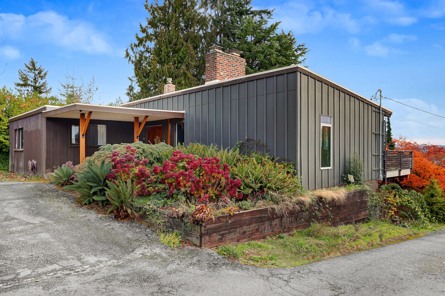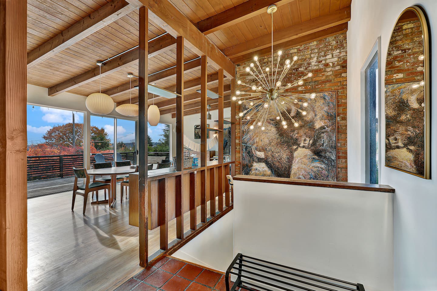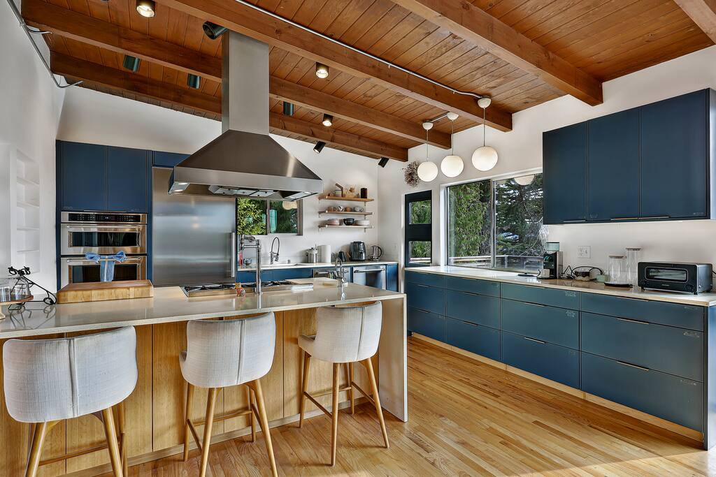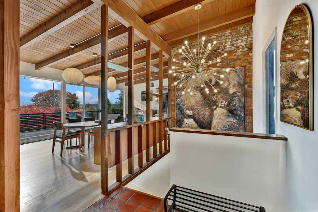 This is a lovely 1954 custom built midcentury home located on the outskirts of Seattle. It is located on a quiet street, and is convenient to the airport as well as being an easy drive to downtown. The kitchen has been remodeled with a 6-burner gas stove, an in-wall oven and microwave, spacious counters, and two dishwashers. The daylight basement includes a billiard room and media room for watching TV and movies. In the backyard, you will find a big jungle gym that is great for kids.