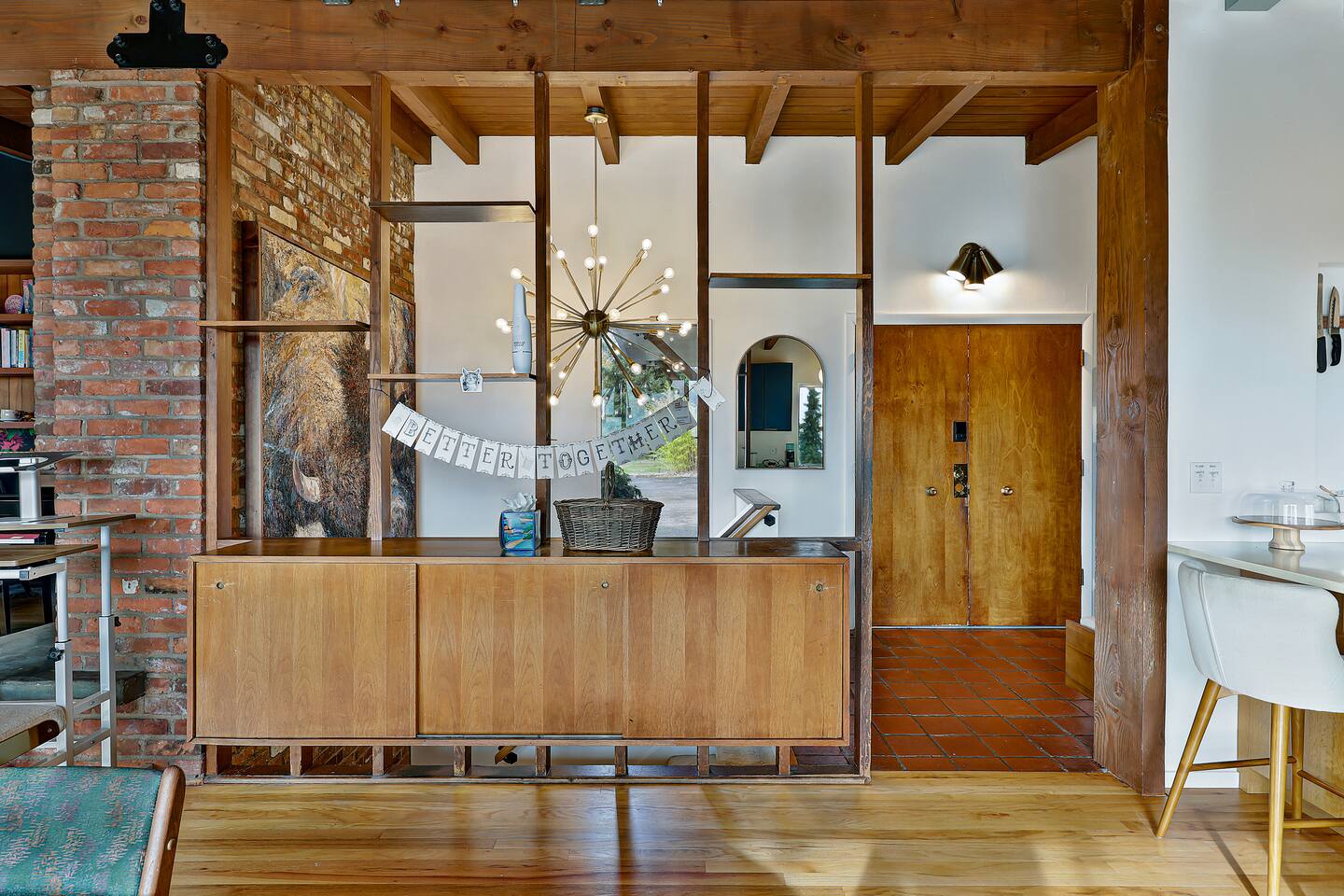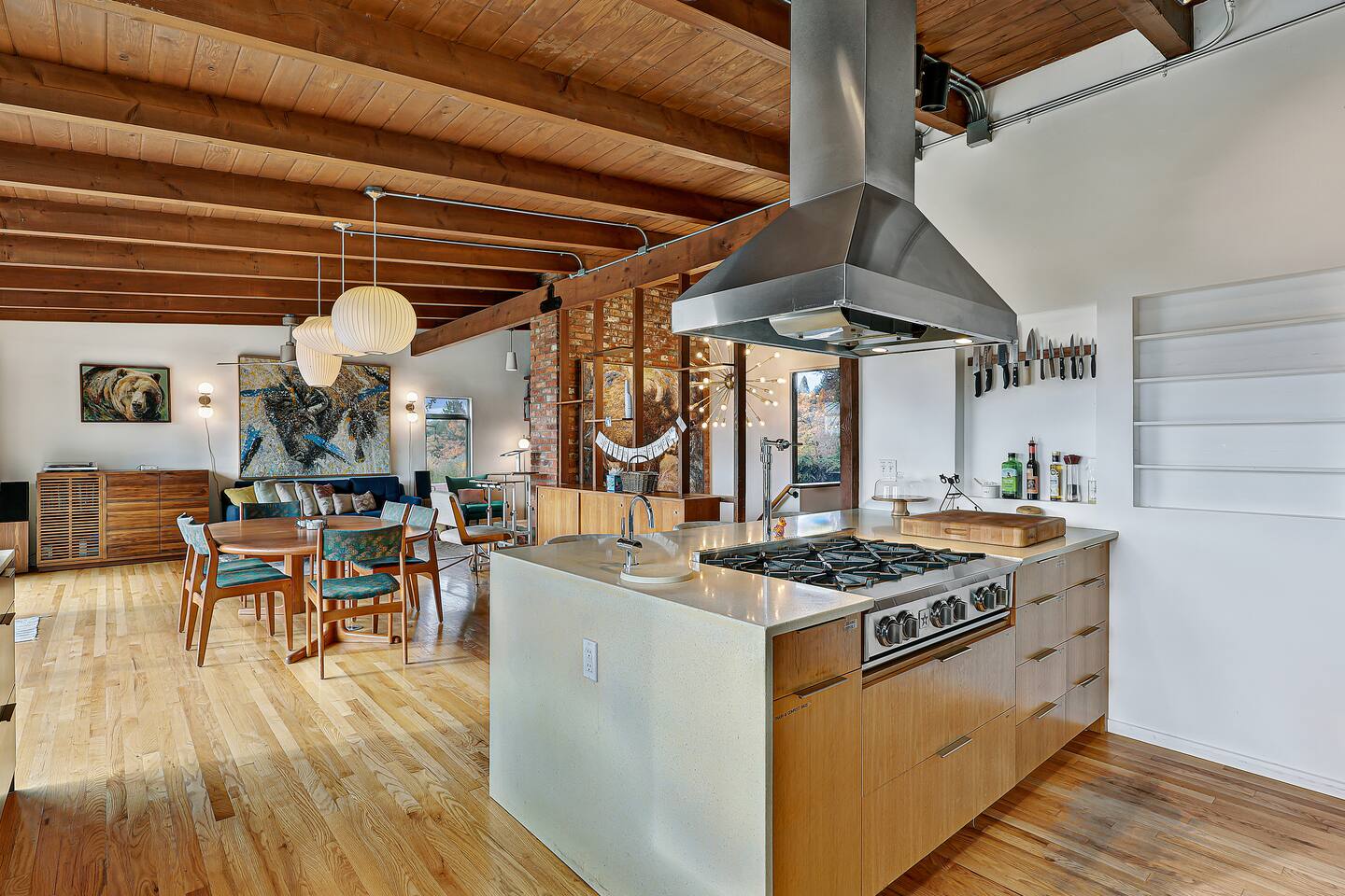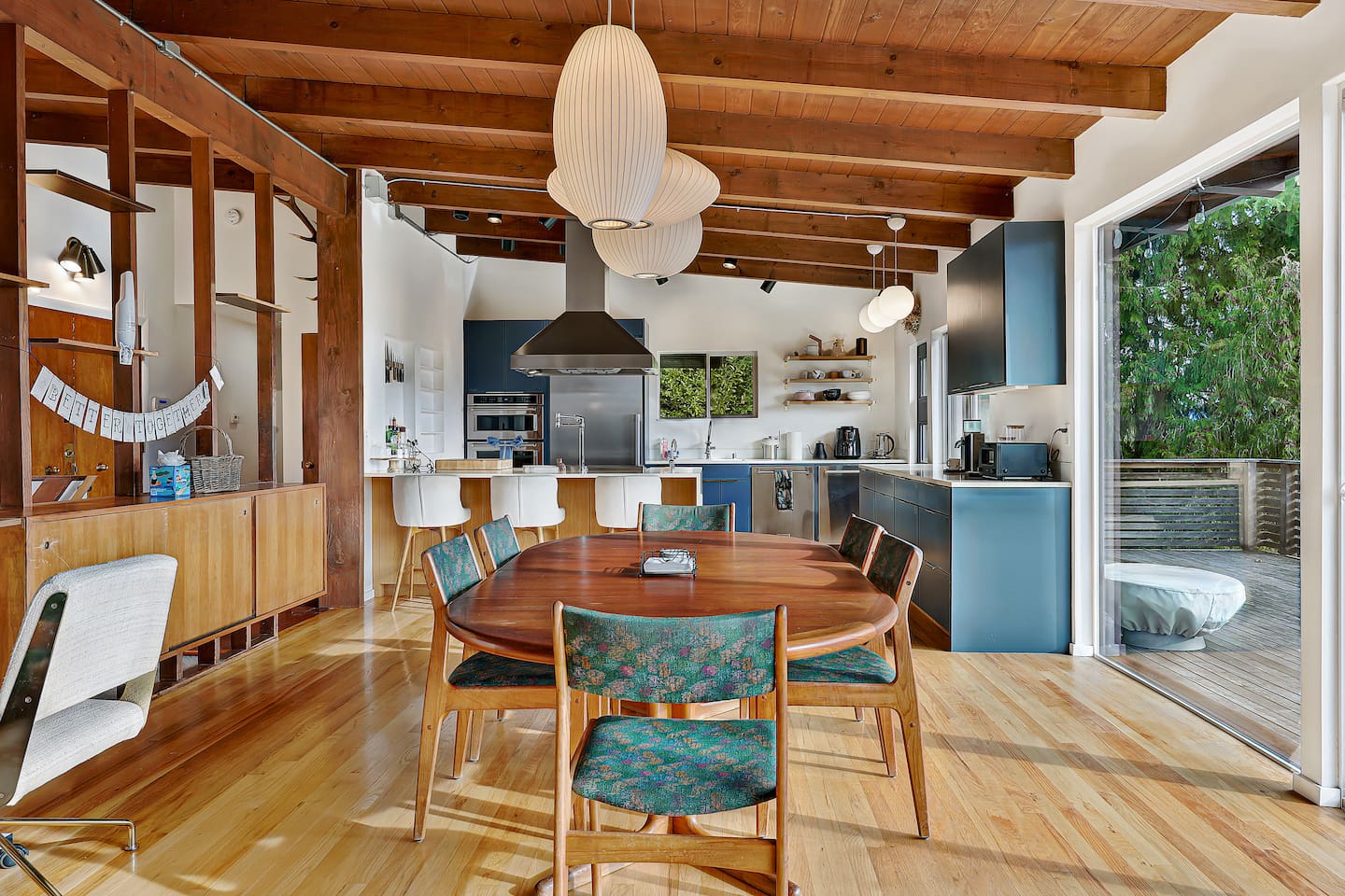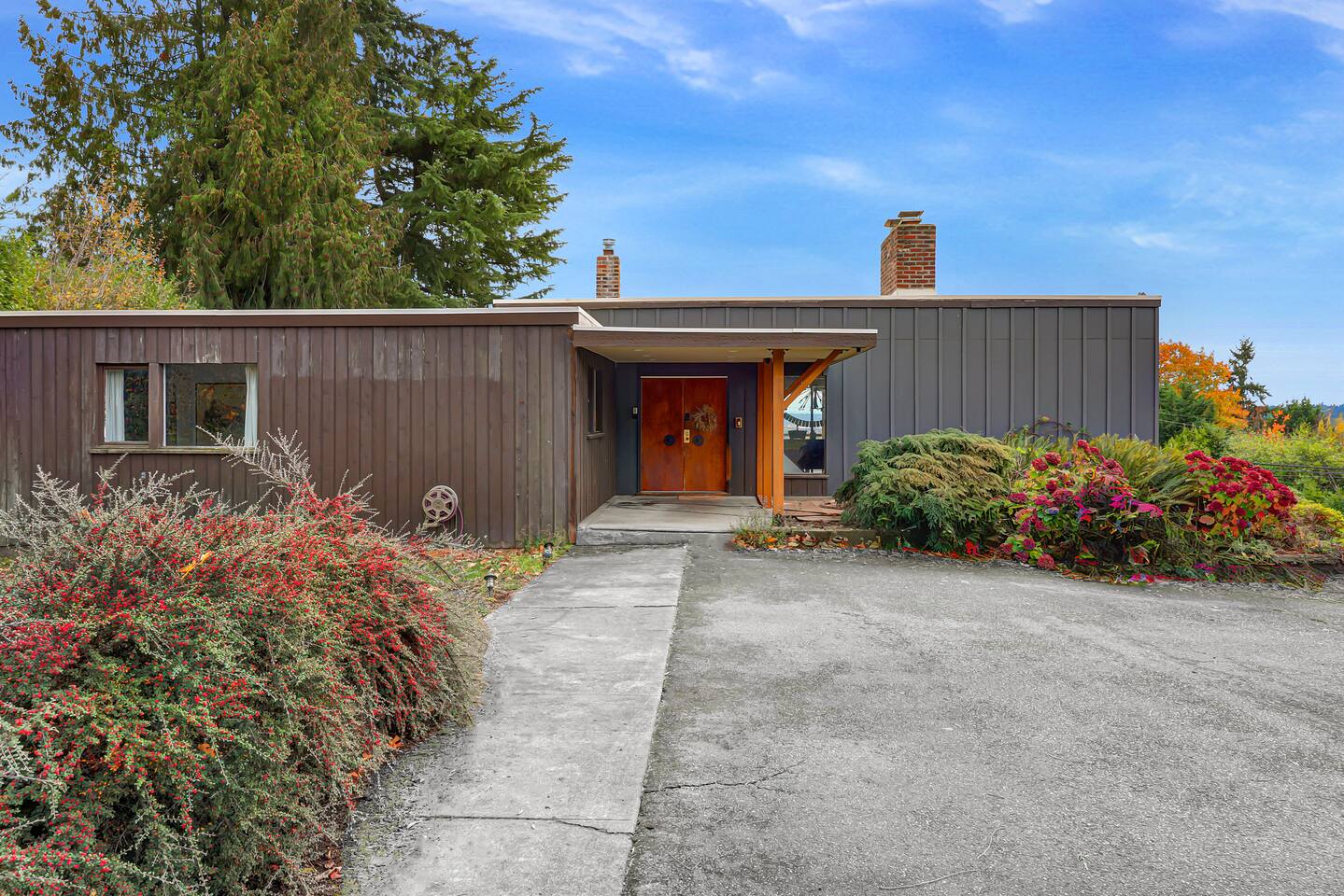 This is a lovely 1954 custom built midcentury home located on the outskirts of Seattle. It is located on a quiet street, and is convenient to the airport as well as being an easy drive to downtown. The kitchen has been remodeled with a 6-burner gas stove, an in-wall oven and microwave, spacious counters, and two dishwashers. The daylight basement includes a billiard room and media room for watching TV and movies. In the backyard, you will find a big jungle gym that is great for kids.