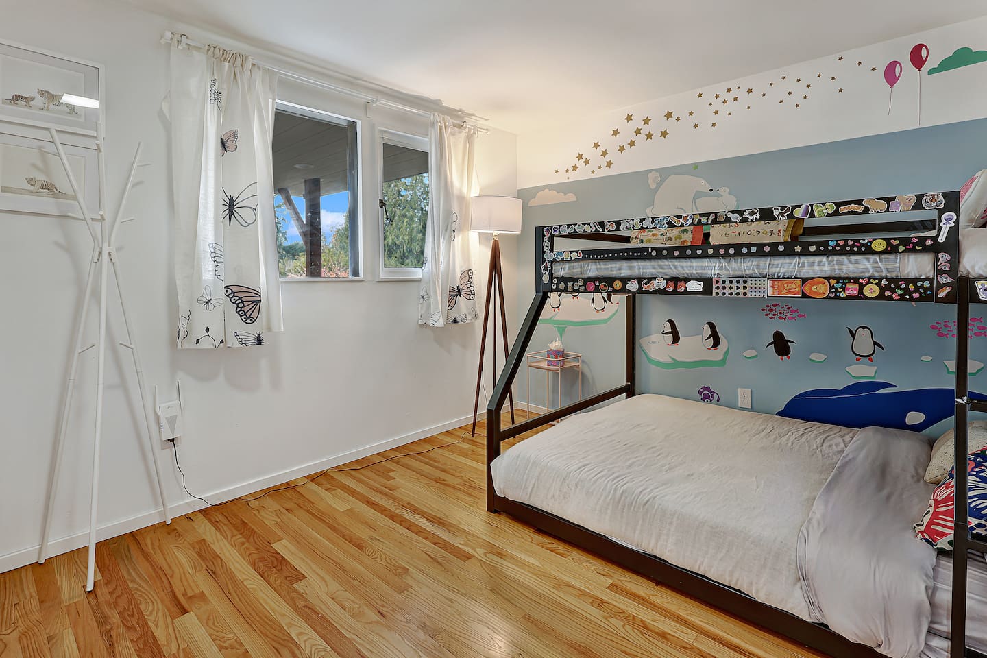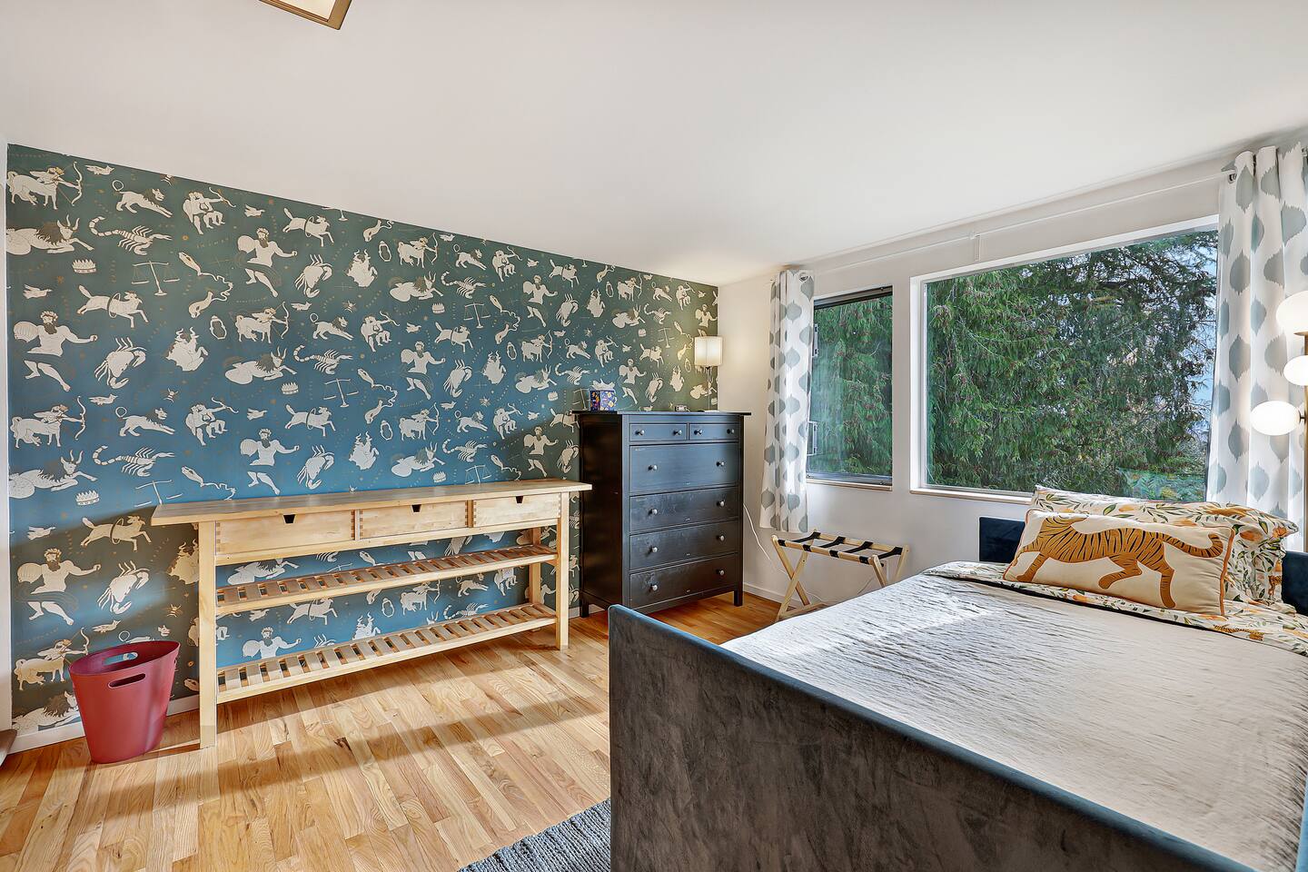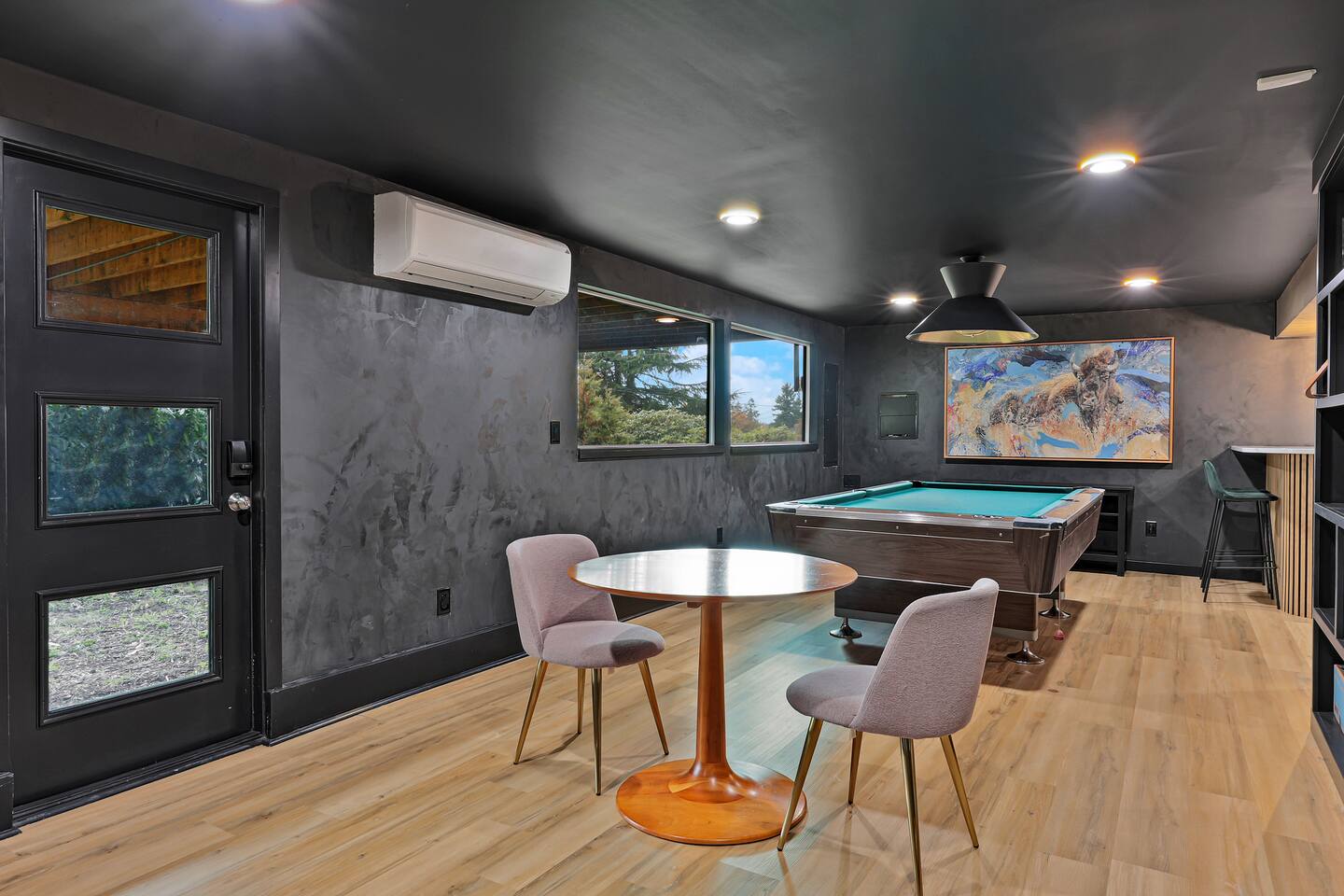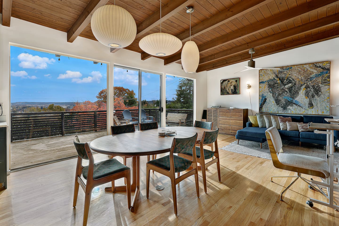 This is a lovely 1954 custom built midcentury home located on the outskirts of Seattle. It is located on a quiet street, and is convenient to the airport as well as being an easy drive to downtown. The kitchen has been remodeled with a 6-burner gas stove, an in-wall oven and microwave, spacious counters, and two dishwashers. The daylight basement includes a billiard room and media room for watching TV and movies. In the backyard, you will find a big jungle gym that is great for kids.