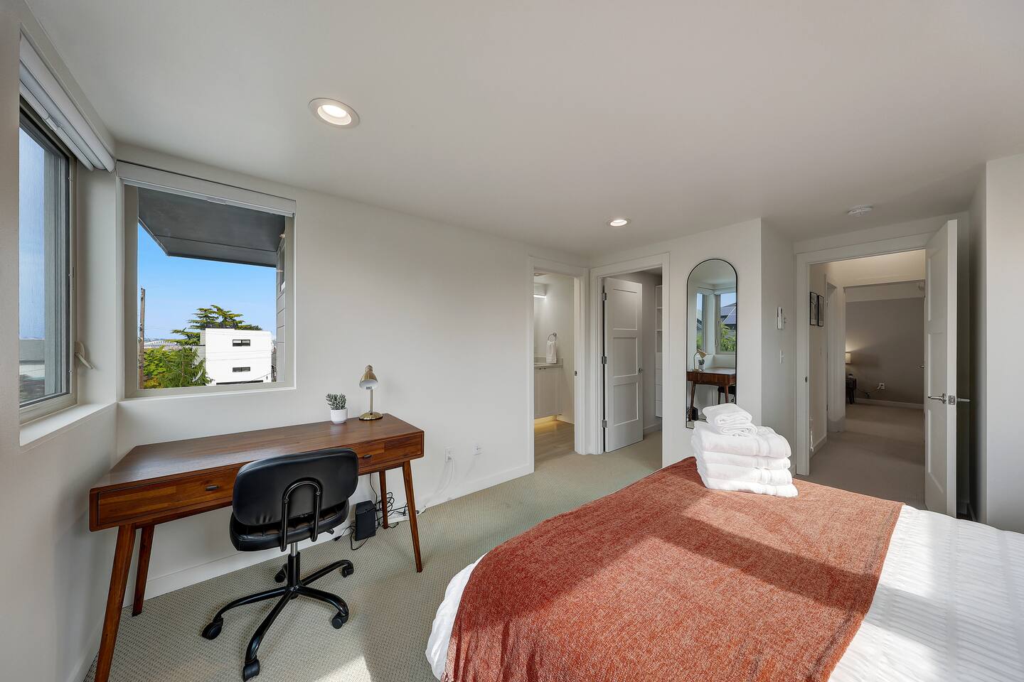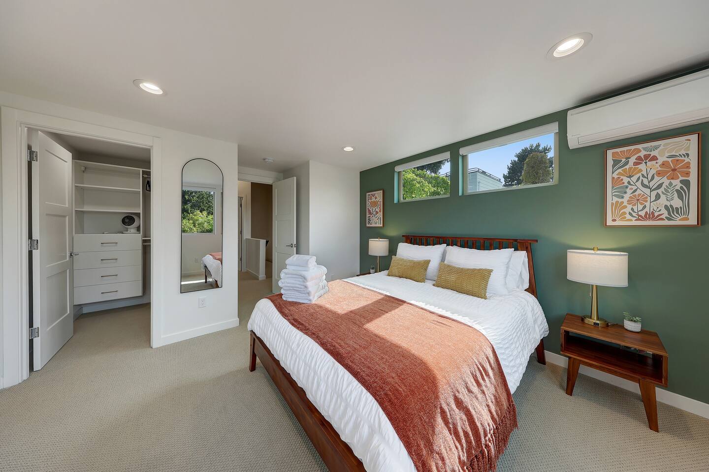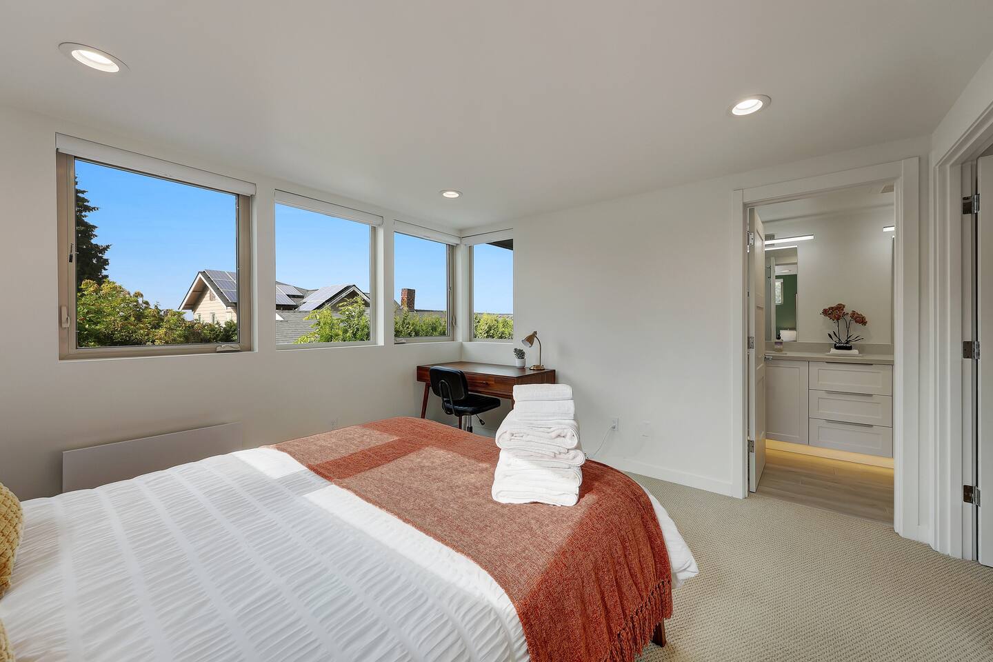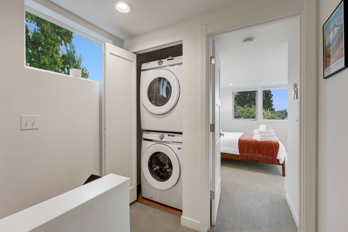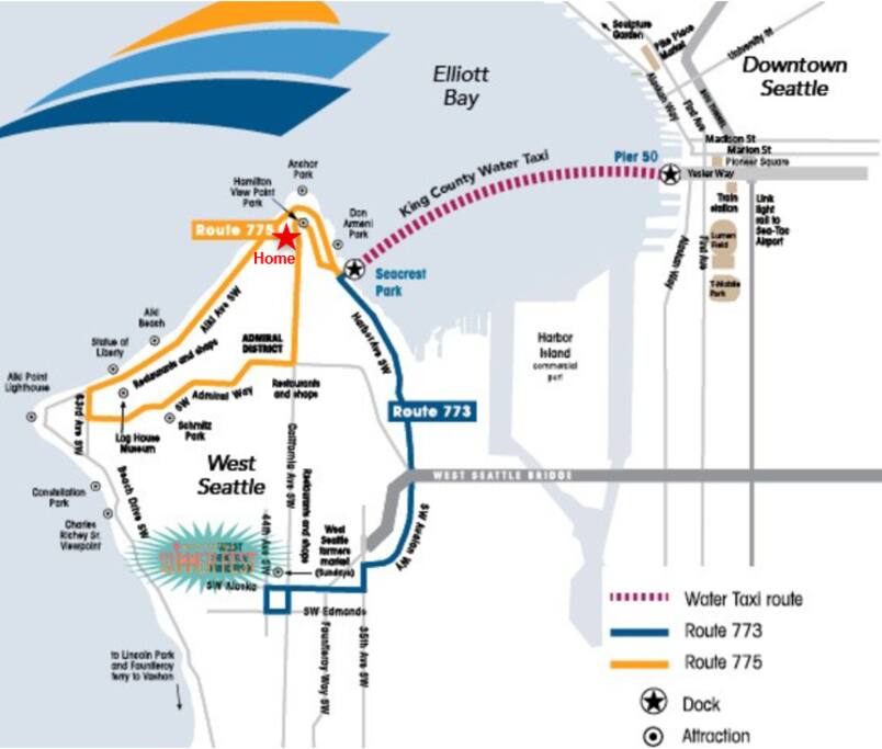 First Floor - Living room with Smart TV, air conditioner/heating, and board games. - Fully stocked kitchen with new stainless steel appliances, cooking and baking essentials, coffee, and tea. - Half bathroom off the kitchen. - Dining table with seating for four. - Sliding door to private patio. Second Floor - Primary bedroom w/ view of Downtown Seattle and Puget Sound, queen bed, ensuite bathroom with dual vanity, private toilet, and standing shower. Room darkening (not blackout) shades on all windows. - Secondary bedroom with queen bed and vaulted ceilings. Shades on windows except one small window without a shade. - Second bathroom with tub. - Air conditioner/heating in both bedrooms - Washer and dryer with laundry detergent. 🚶♂️ Walking & Shuttle Access - 15‑minute walk (0.8 mi) to the West Seattle Water Taxi at Seacrest Park, providing a smooth 10–15 min ferry ride to downtown Pier 50 and easy shuttle connections to Alki Beach. - FREE West Seattle shuttle buses (775 & 773): Route 775 runs between Seacrest Park (water taxi dock), California Ave SW, Admiral District, Alki Beach and back to Seacrest Park for seamless first/last-mile service. Route 773 runs between Seacrest Park and West Seattle Junction. 🚌 Local Bus Lines - California Ave SW & SW Seattle St: 1-2 min walk, served by Metro route 775 (West Seattle shuttle bus) - California Ave SW & SW Hill St: 7-8 min walk, served by Metro routes 128 & 775 - California Ave SW & SW Admiral Way stop is a 15-16 min walk, served by Metro routes 50, 56, 57, and 775